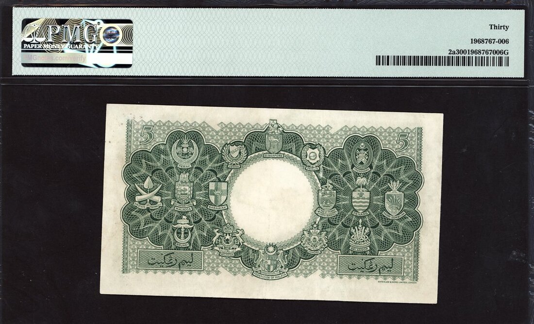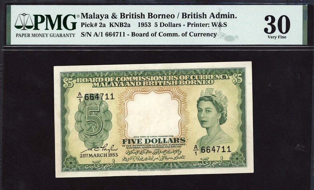 Board of Commissioners of Currency, Malaya and British Borneo, $5, 21 March 1953, serial number A/1 664711, (Pick 2a, TBB B102a), in PMG holder 30 Very Fine, first prefix