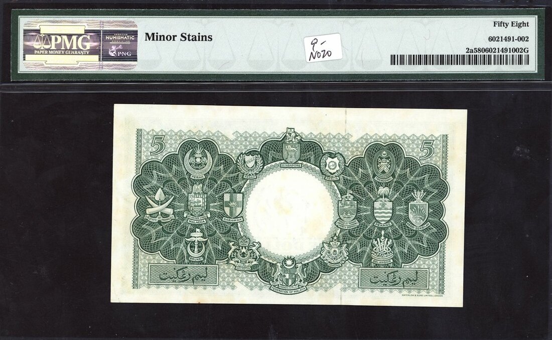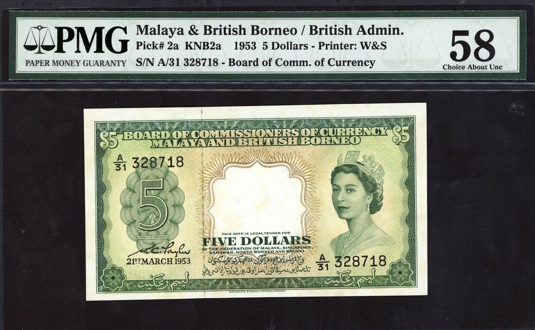 (x) Board of Commissioners of Currency Malaya and British Borneo, $5, 21 March 1953, serial number A/31 328718, (Pick 2a, TBB B102a), in PMG holder, minor stains, 58 Choice About Unc