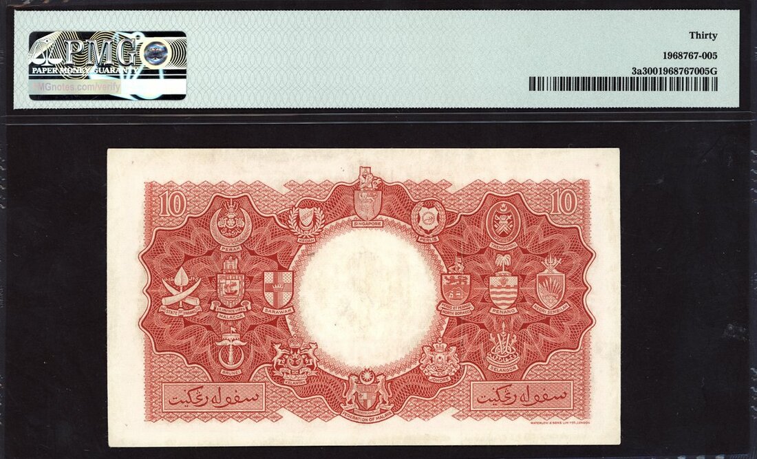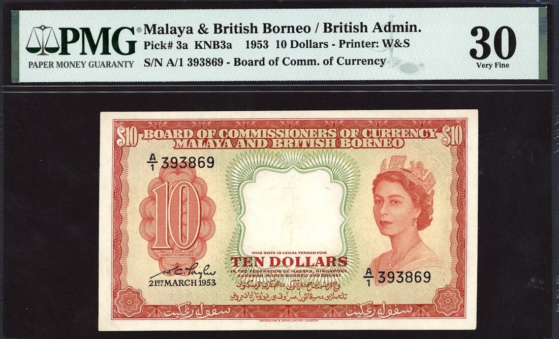 Board of Commissioners of Currency, Malaya and British Borneo, $10, 21 March 1953, serial number A/1 393869, (Pick 3, TBB B103), in PMG holder 30 Very Fine, first prefix