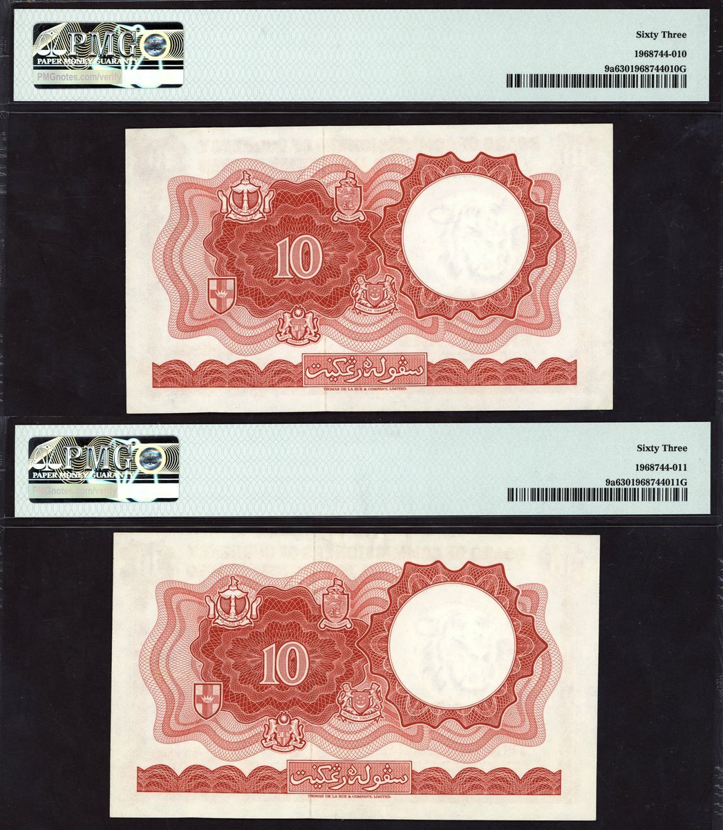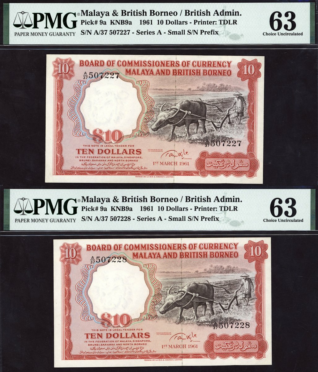 Board of Commissioners of Currency Malaya and British Borneo, consecutive pair 10 dollars, 1st March 1961, serial number A/37 507227-507228, (Pick 9a, KNB 9a, TBB B109a), in PMG holders 63 Choice Uncirculated, rare as consecutive pair (2 notes)