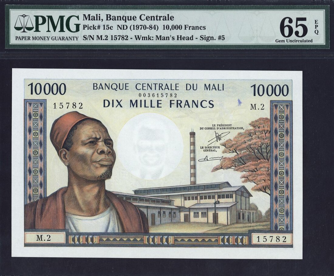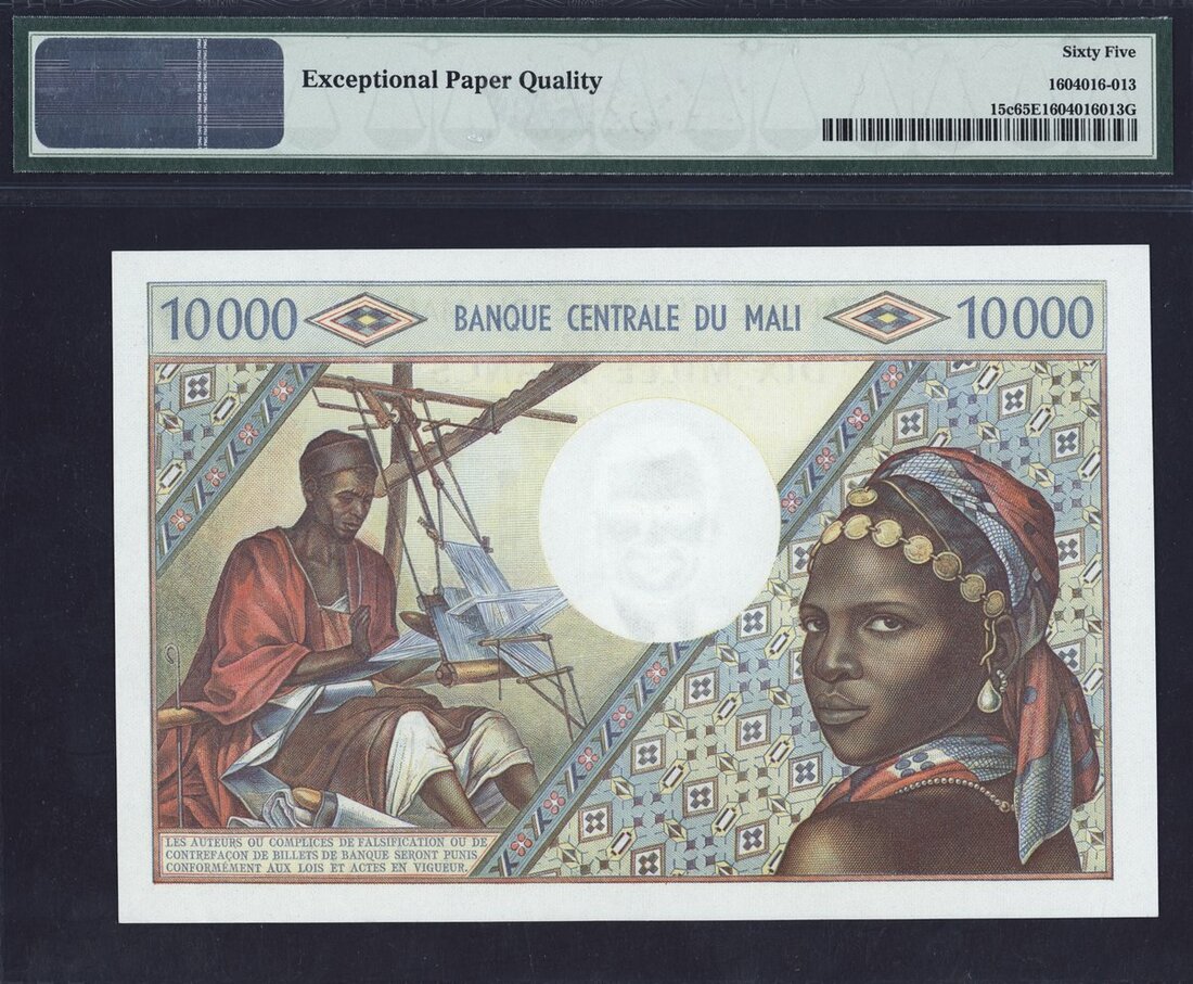(x) Banque Centrale du Mali, 10000 francs, ND (1970), serial number M.2 15782, blue and multicoloured, local man wearing red hat at left, to right a ceramic factory at Djikoroni, signatures of Dussine and Makalou, reverse blue and multicoloured, girl at right, man at loom at left,