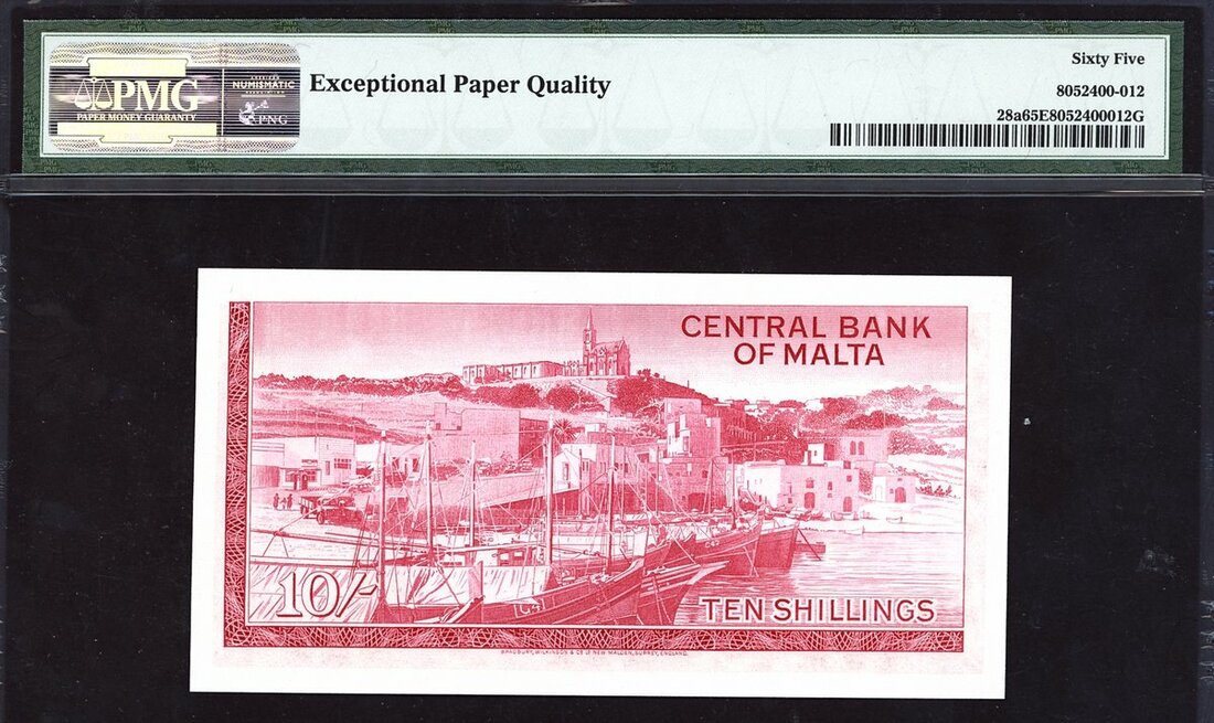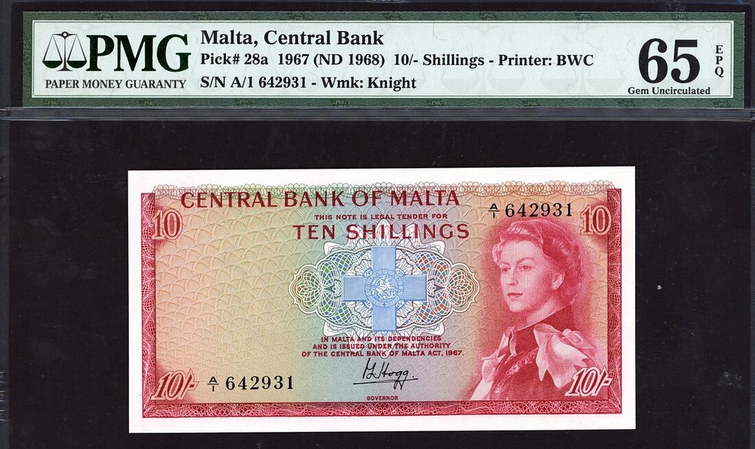 (x) Central Bank of Malta, 10 shillings, ND (1968), serial number A/1 642931, (Pick 28a, TBB B201a), in PMG holder 65 EPQ Gem Uncirculated