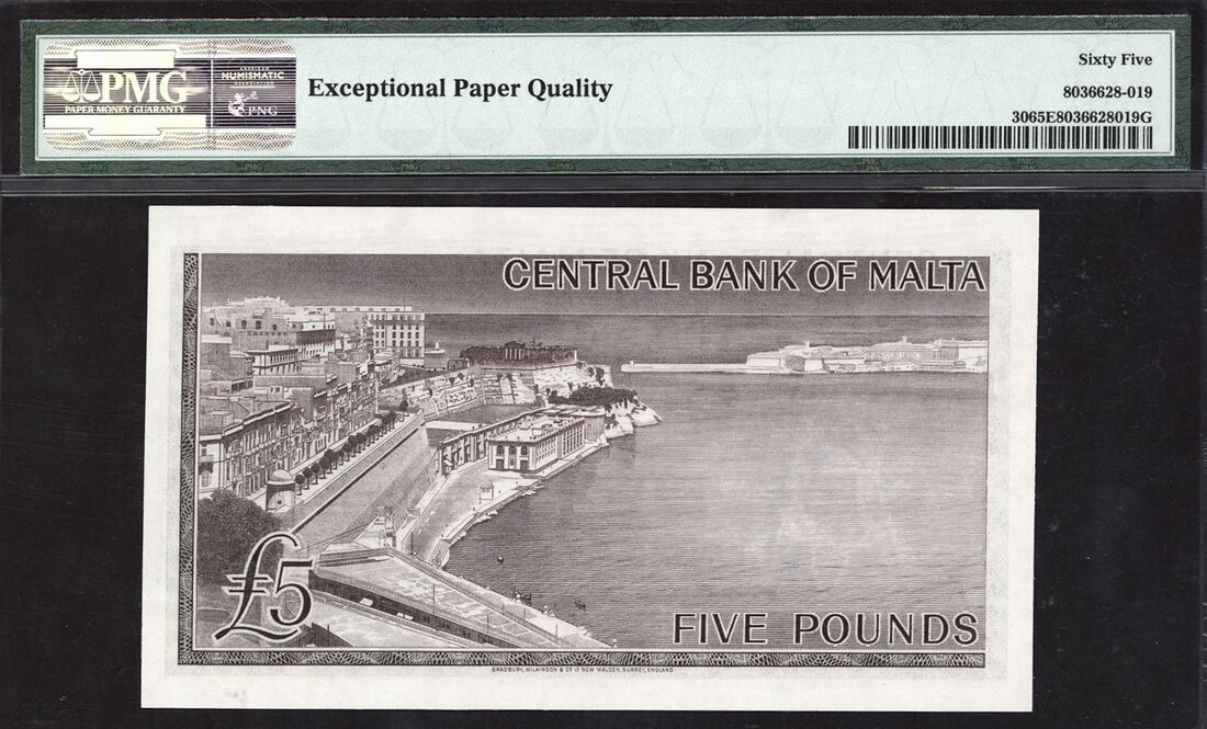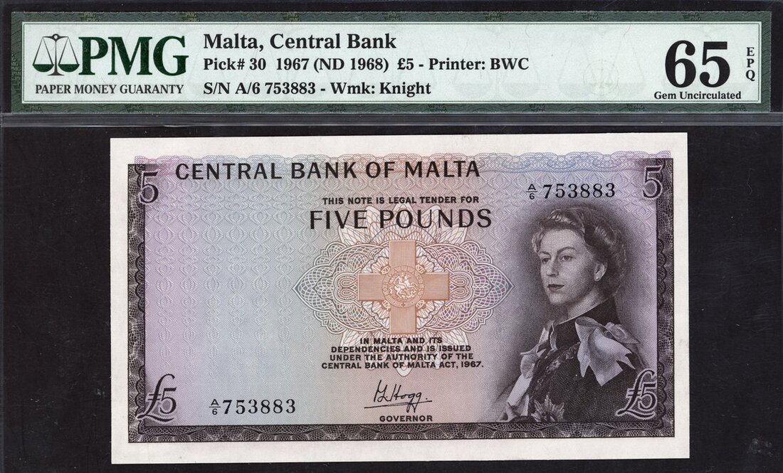 (x) Central Bank of Malta, £5, 1967, serial number A/6 753883, violet and brown on multicolour, Queen Elizabeth II at right, St. George's Cross at centre, reverse scenery of the Grand Harbour,