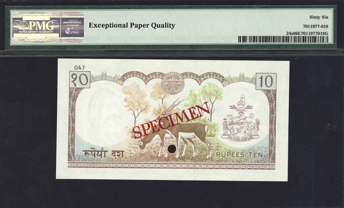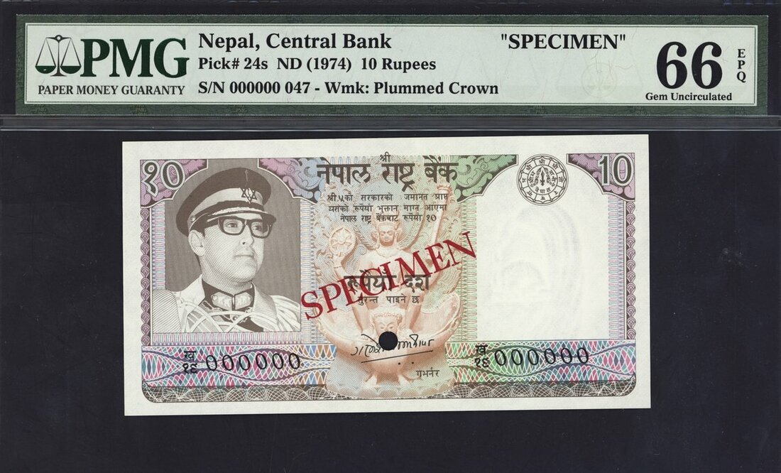 Central Bank of Nepal, specimen 10 rupees, ND (1974), (Pick 24s, TBB B218s), in PMG holder 66 EPQ Gem Uncirculated, only 1 on PMG Census, scarce