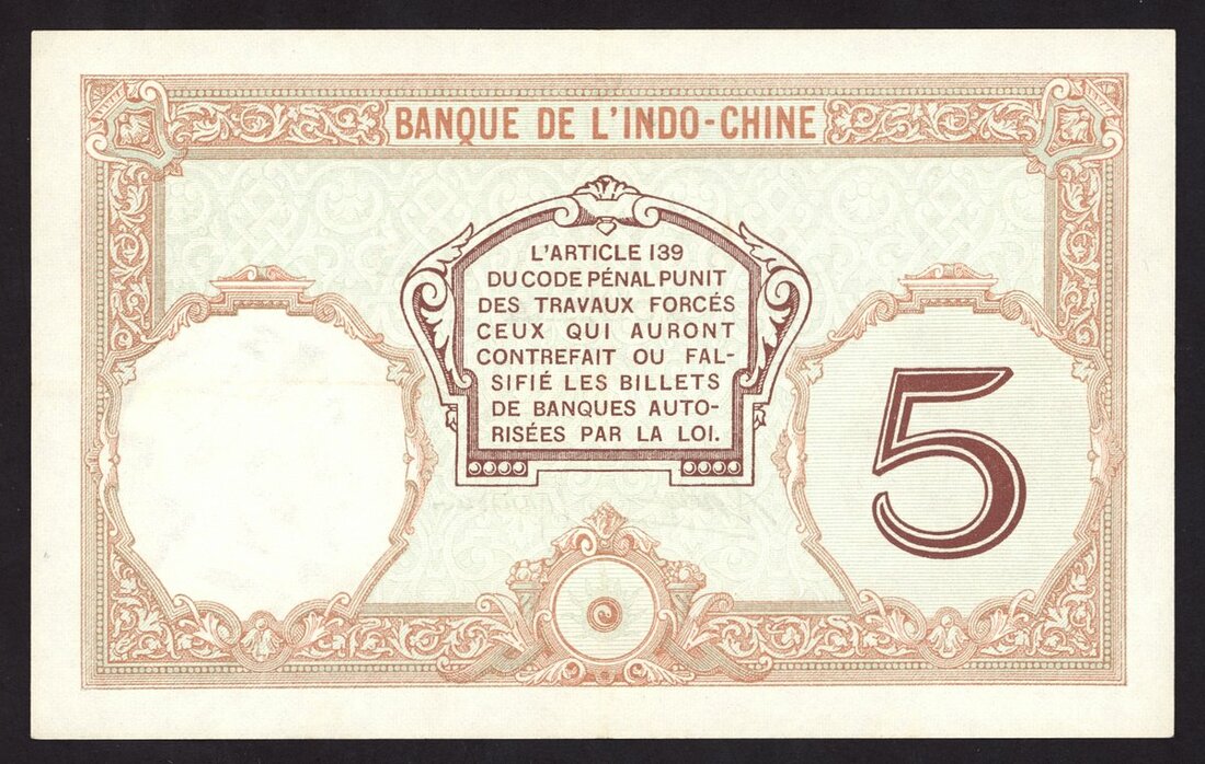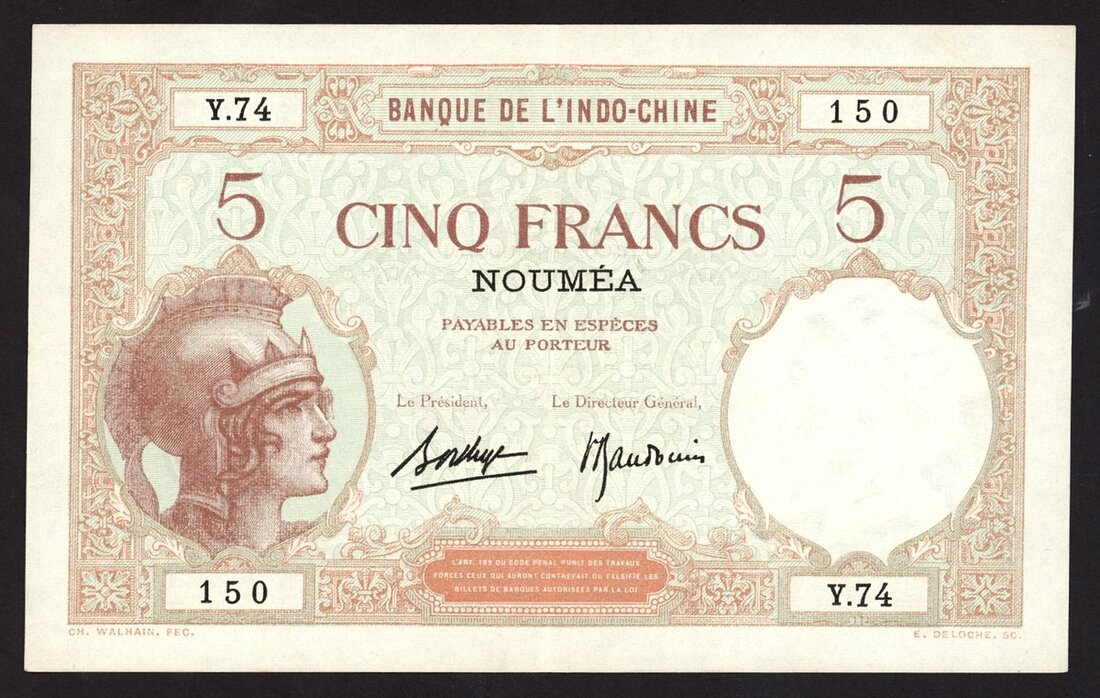 (x) Banque de L'Indo-Chine, (Noumea), 5 francs, signature Borduge and Baudouin,