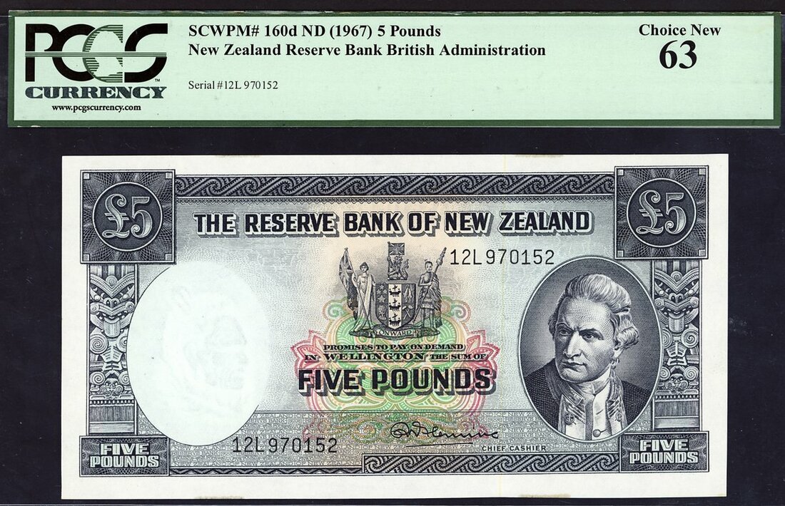 (x) Reserve Bank of New Zealand, £5, ND (1967), prefix 12L, dark blue-grey, Captain Cook at right, Fleming signature