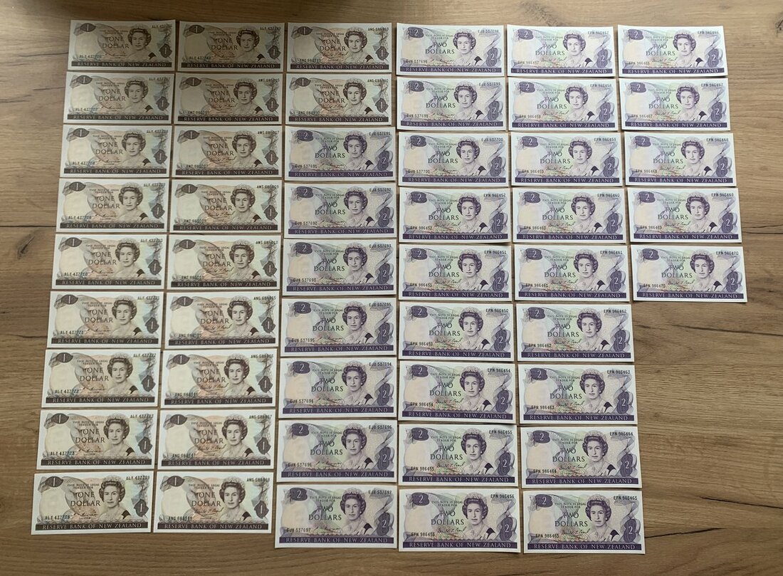 (x) Reserve Bank of New Zealand, $1 (20) and $2 (30), ND (1981-89), (Pick 169b, c, 170b, c), several consecutive runs, uncirculated (50 notes)