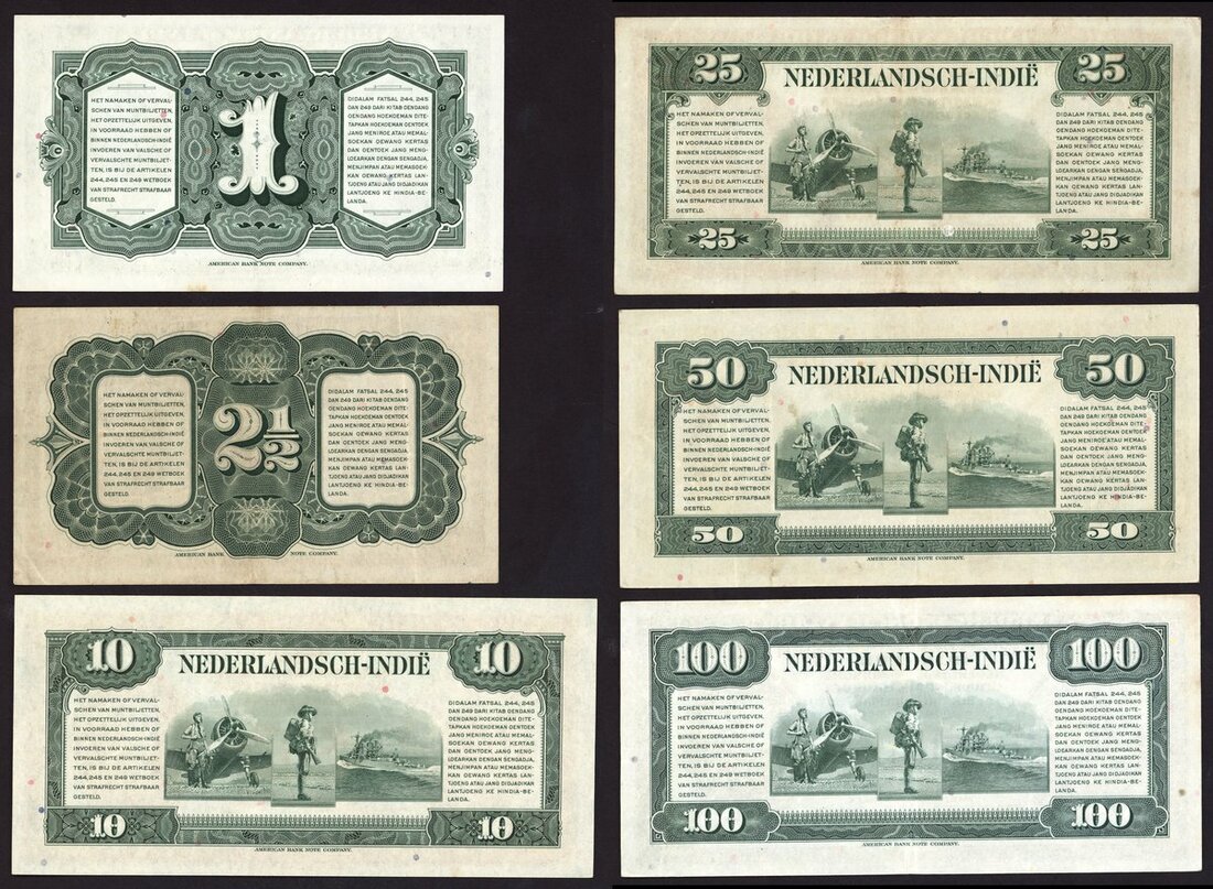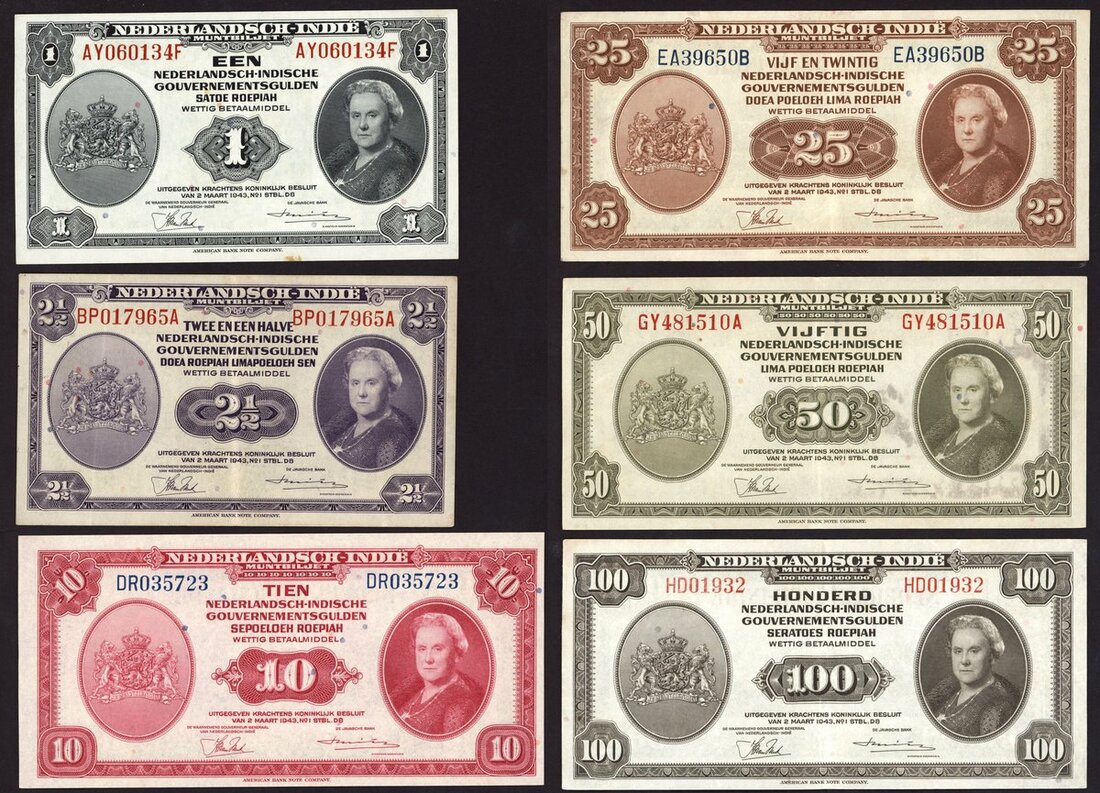 Nederlandsch-Indie Muntbiljet, partial set of the 1943 issues, including 1, 2 1/2, 10, 25, 50, 100 gulden, (Pick 111, 112, 114, 115, 116, 117), 1 and 10 AUNC, 25 EF, others VF (5 notes)