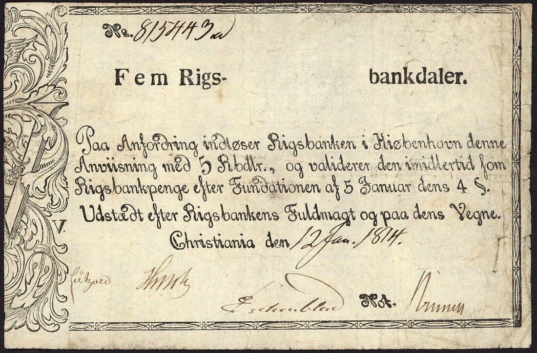 Rigsbankens Norske Avdeling, Norway, 5 rigsbankdaler, manuscript date 12 January 1814, serial number 815449a, black and white on parchment like paper, ornate vertical panel at left, two manuscript signatures below