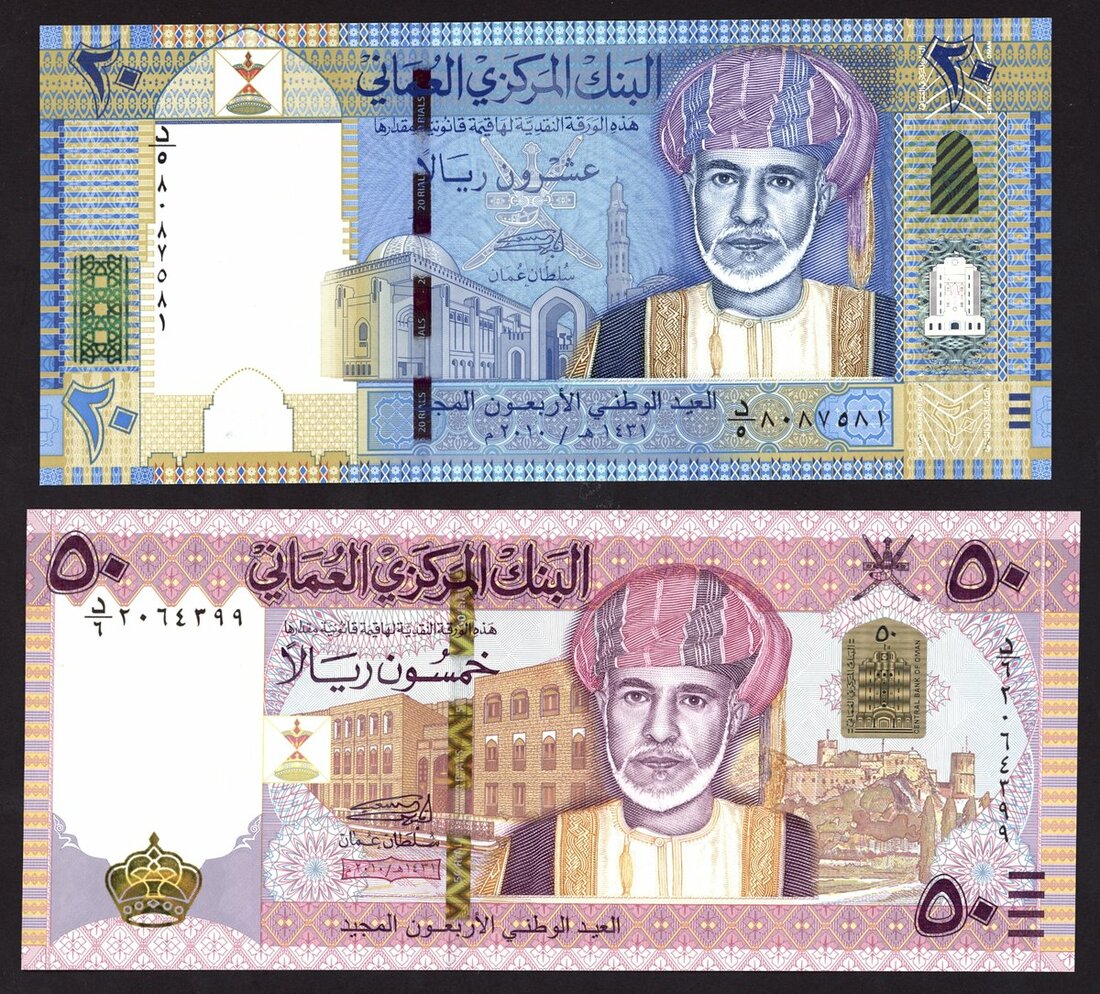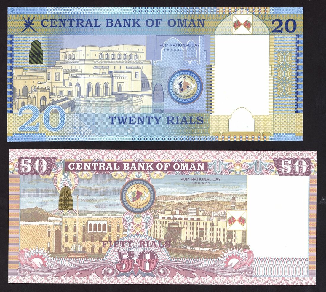 (x) Central Bank of Oman, 20, 50 riyals, 2010, (Pick 46, 47, TBB B232, 235), uncirculated (2 notes)