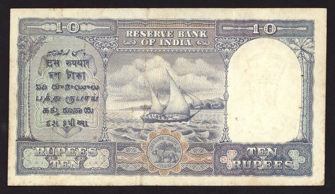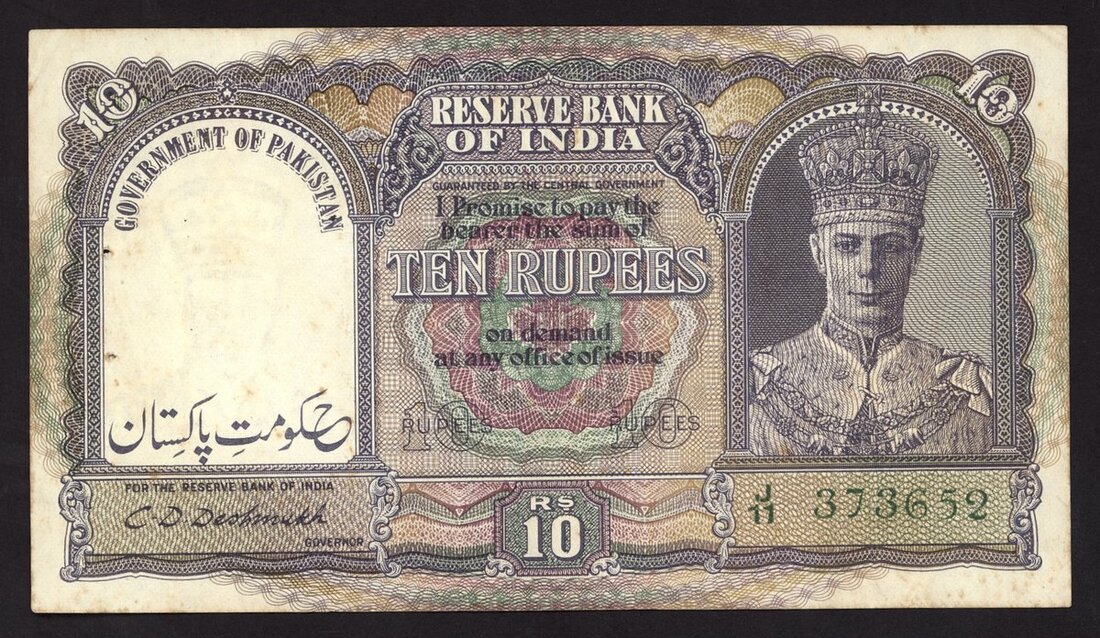 Government of Pakistan, 10 rupees, ND (1948), serial number J/11 373652, (Pick 3, TBB B104), usual staple holes at left, light foxing, very fine, scarce
