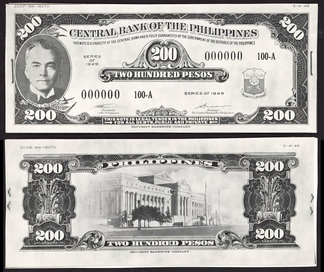 (x) Central Bank of the Philippines, an obverse and reverse photographic proofs for a proposed issue of 200 pesos, 1949, Quezon at left