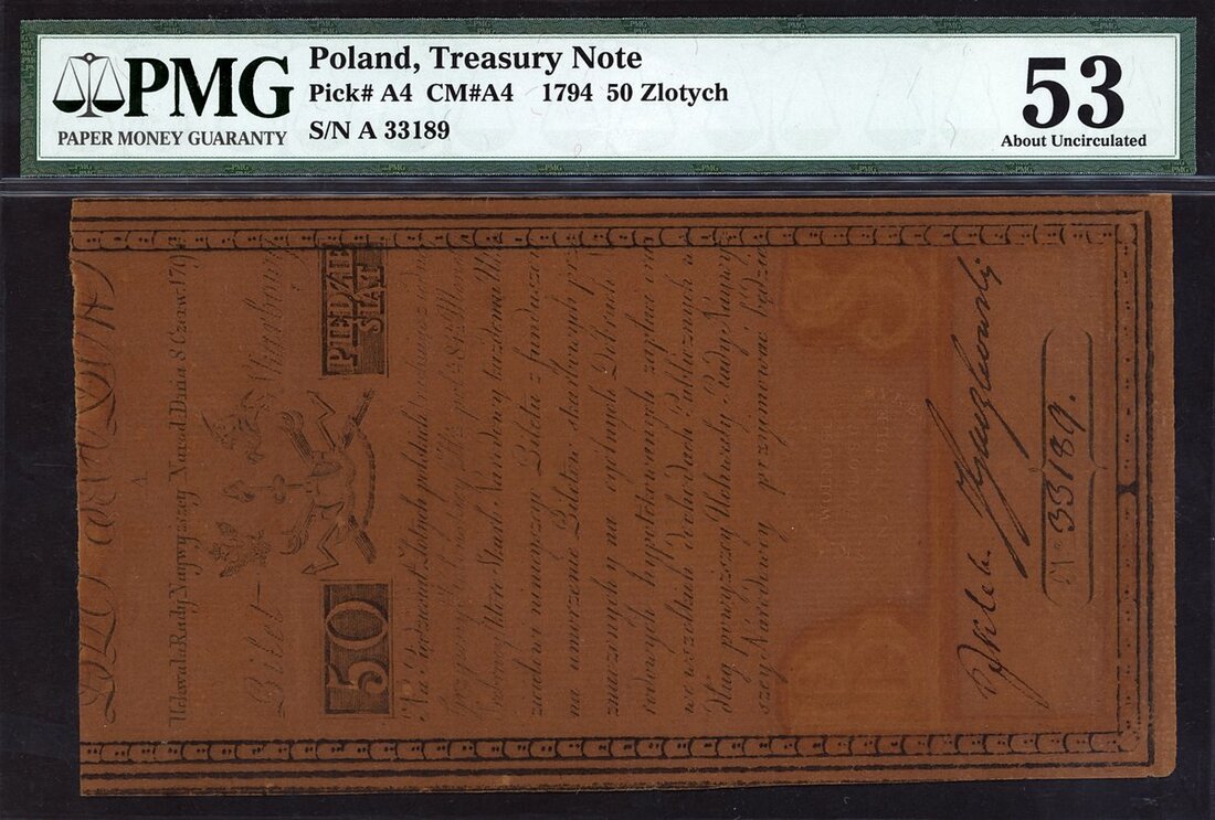 (x) Kingdom of Poland, Bilet Skarbowy, Treasury Note, 50 zlotych, 8 June 1794, serial number 33189, (Pick A4), in PMG holder, previously mounted, 53 About Uncirculated. Good early example in high grade.