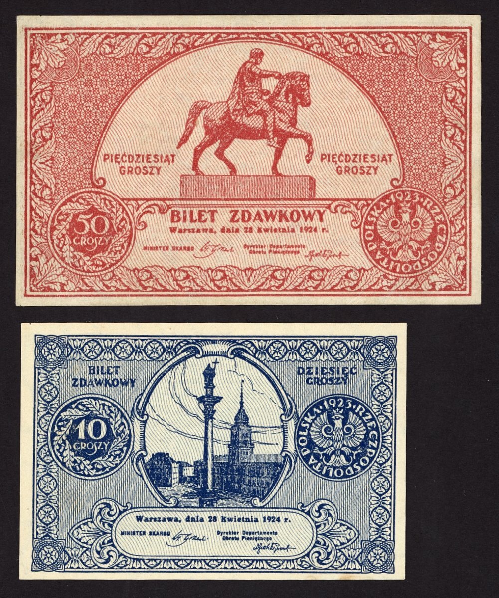 (x) Poland, 10 and 50 groszy, 1924 blue and red respectively,