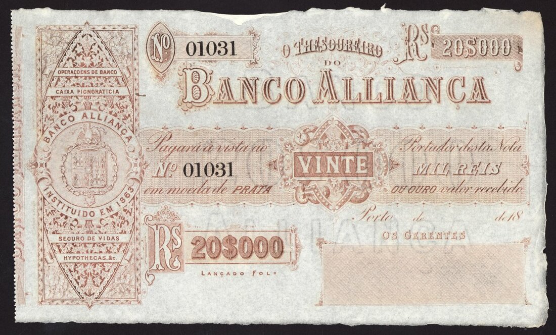 (x) Portugal, Banca Allianca, part issued 20000 reis, ND (ca 1870), serial number 01031, lilac, arms at left