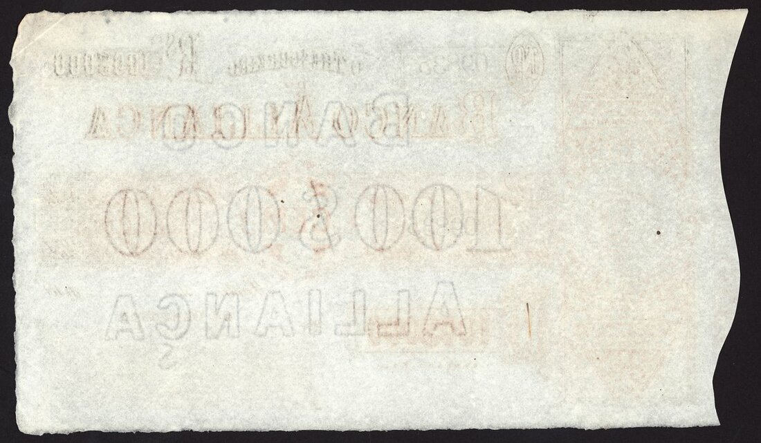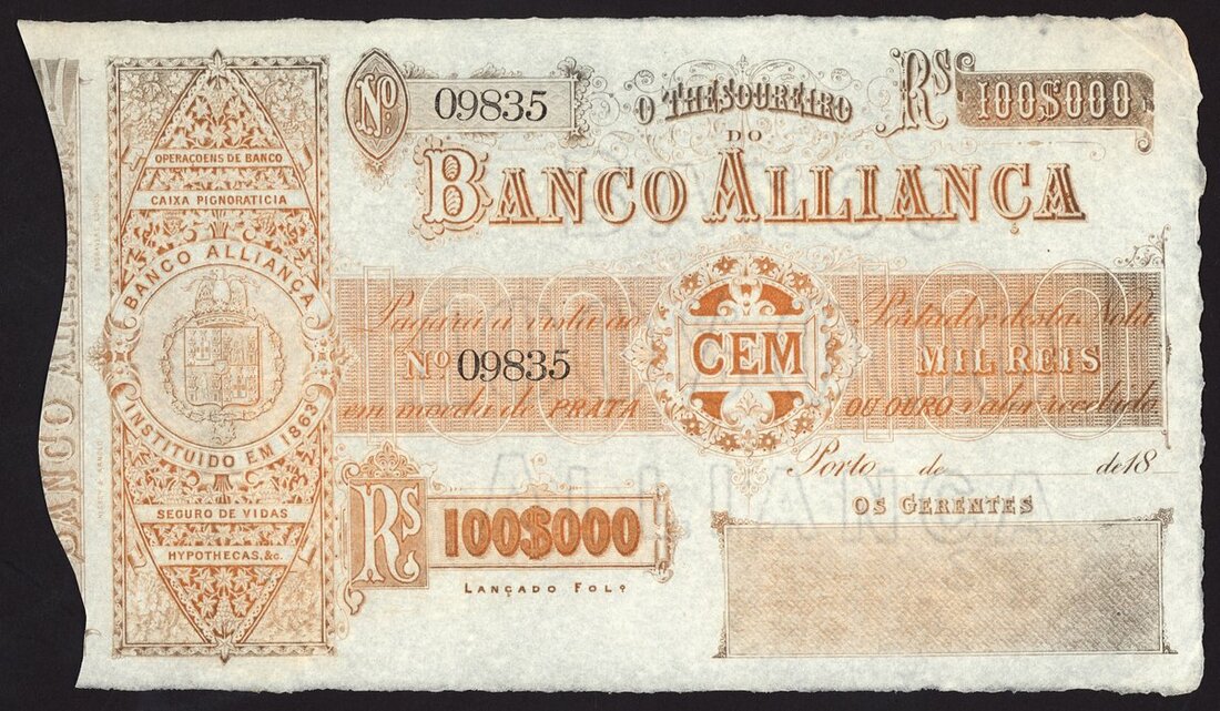 (x) Portugal, Banca Allianca, part issued 100000 reis, ND (ca 1870), serial number 09835, pale red-orange, arms at left