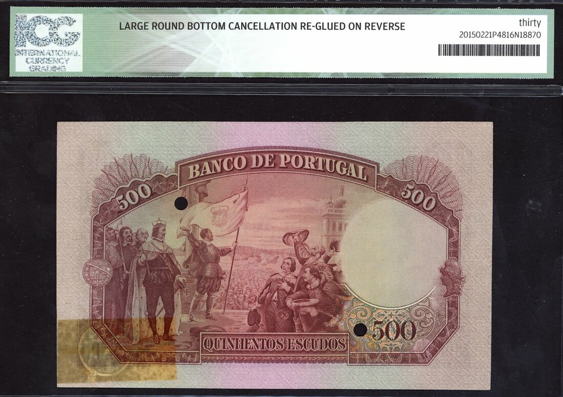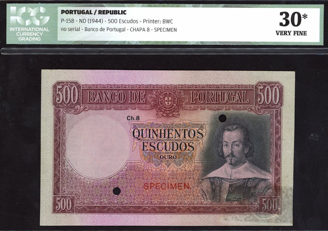 (x) Banco de Portugal, specimen 500 escudos, ND (1944), (Pick 158s), in ICG holder 30* Very Fine, cancellation punch holes, glue on reverse