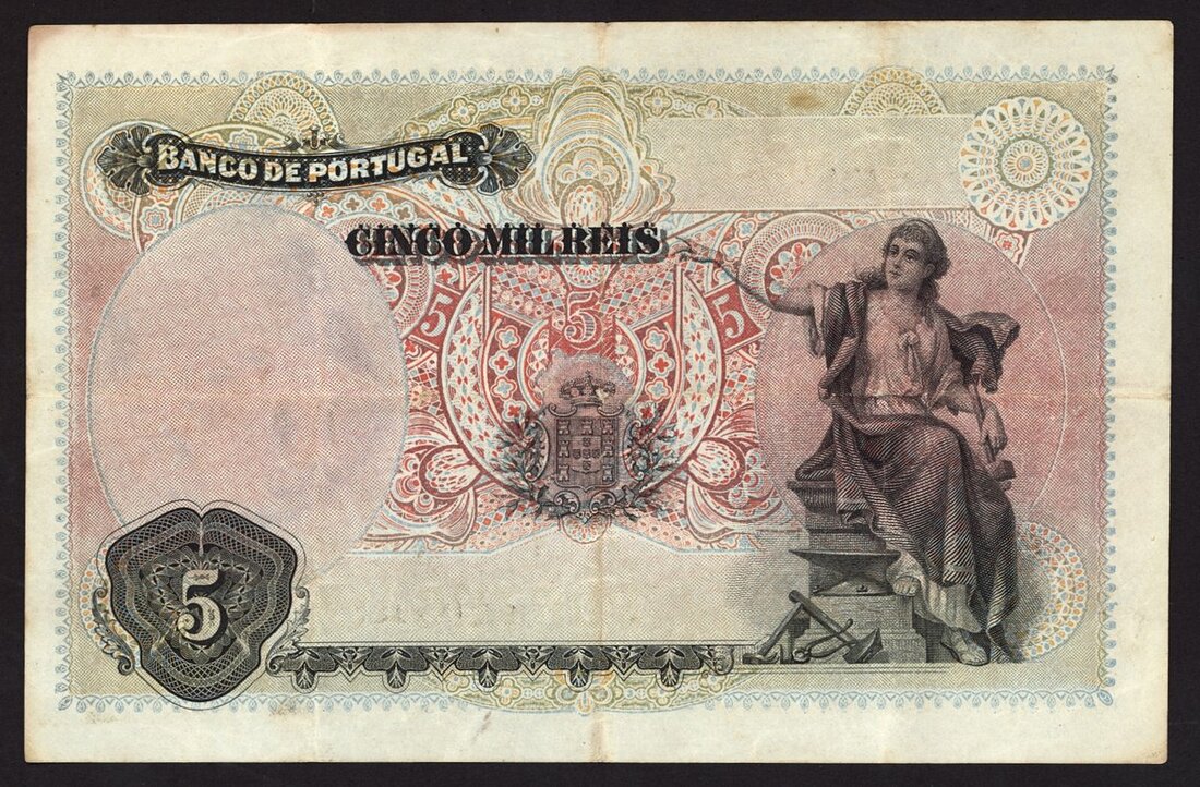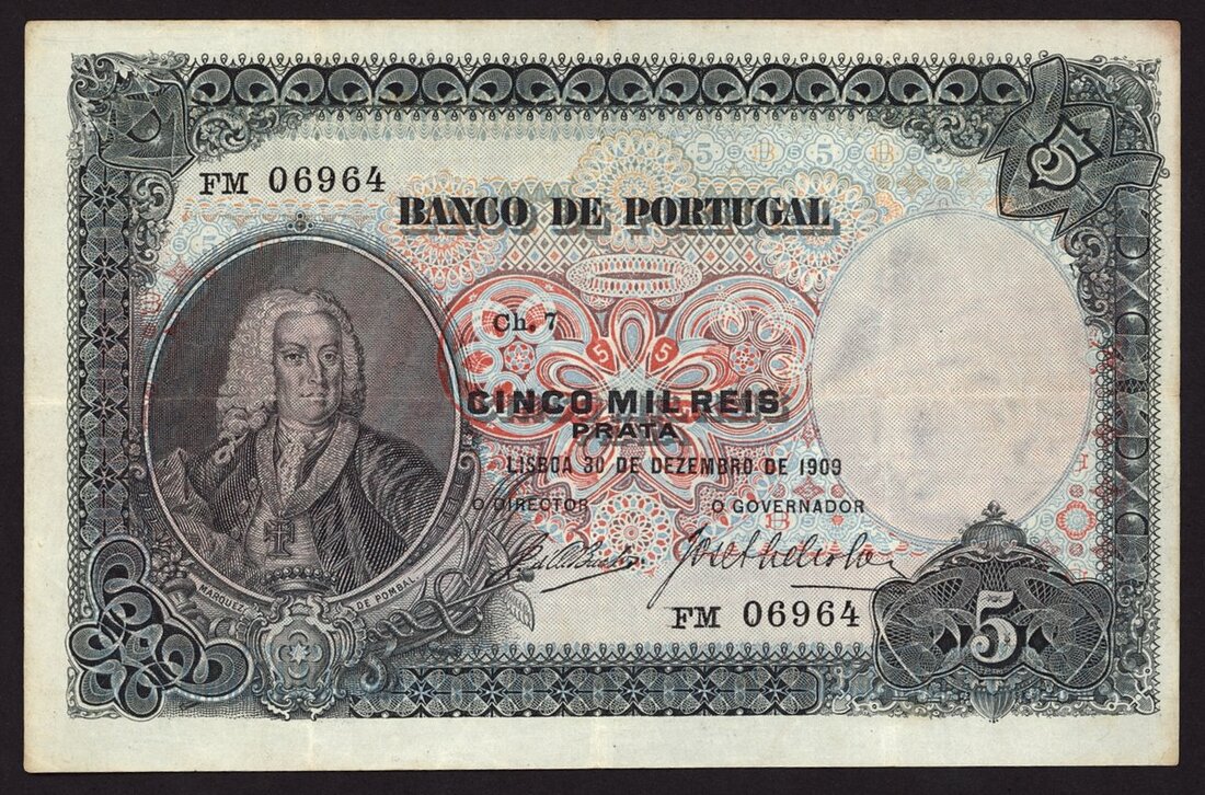 (x) Banco de Portugal, 5000 reis, 30 December 1909 (1911), serial number FM 06964, blue-grey and pink, the Marquis de Pombal at left, arms below