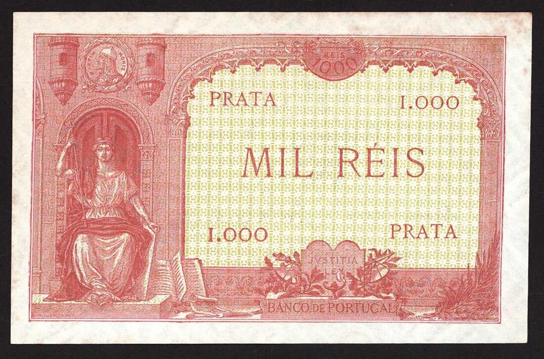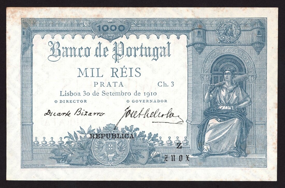 (x) Banco de Portugal, 1000 reis, 30 September 1910, Ch 3, blue and white, maiden at right, arms low left centre, black REPUBLICA overprint in field