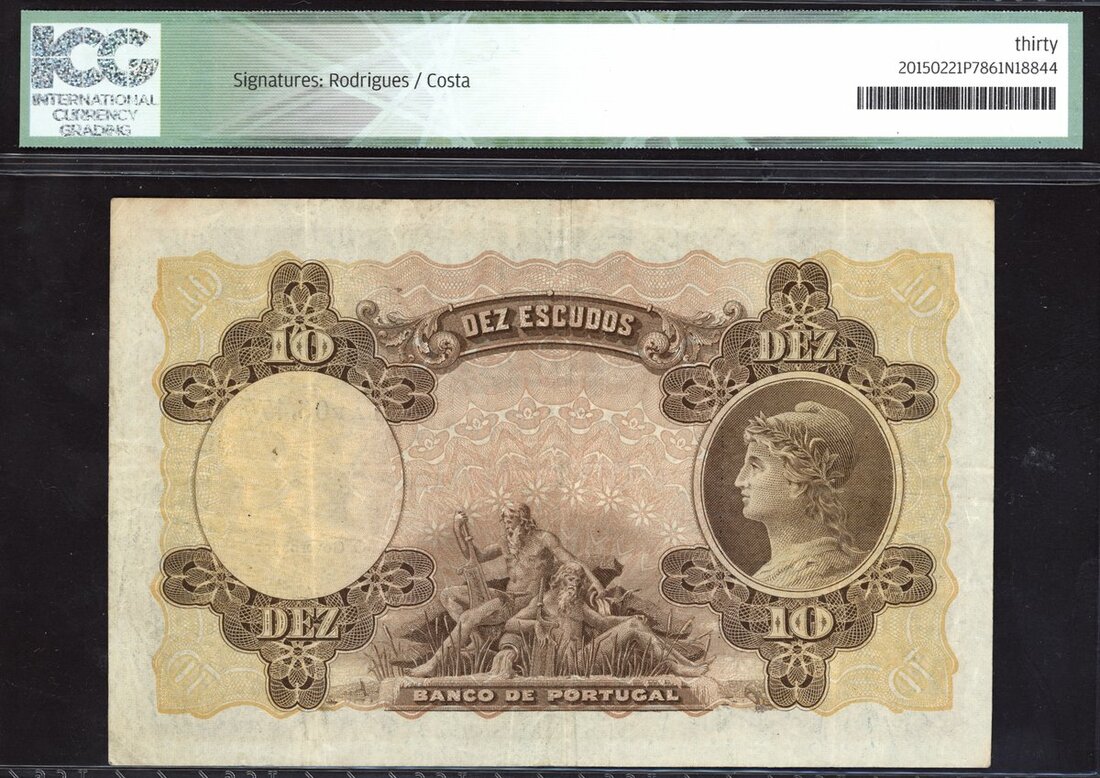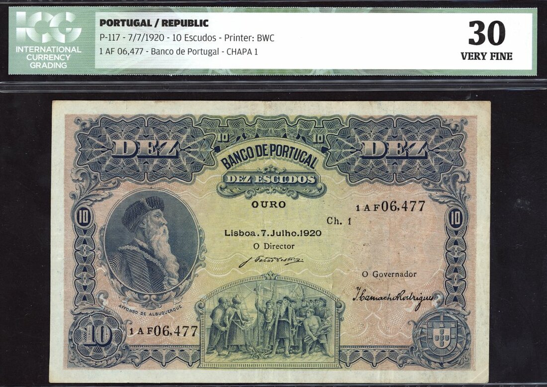 (x) Banco de Portugal 10 escudos, 7 July 1920, serial number 1AF06,477, signature Rodrigues and Costa,