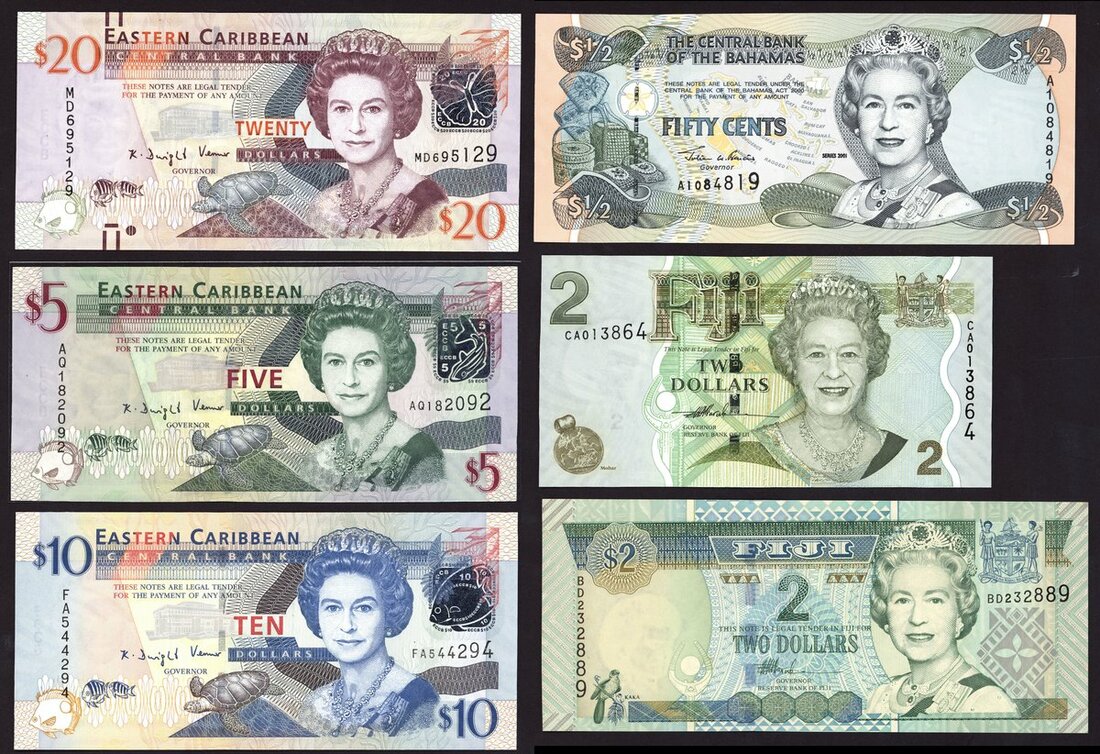 A group of QEII banknotes, including Reserve Bank of Fiji, $2 (2), Bahamas 50 cents, 2001, Eastern Caribbean Central Bank, $5, 10 and 20, 2008