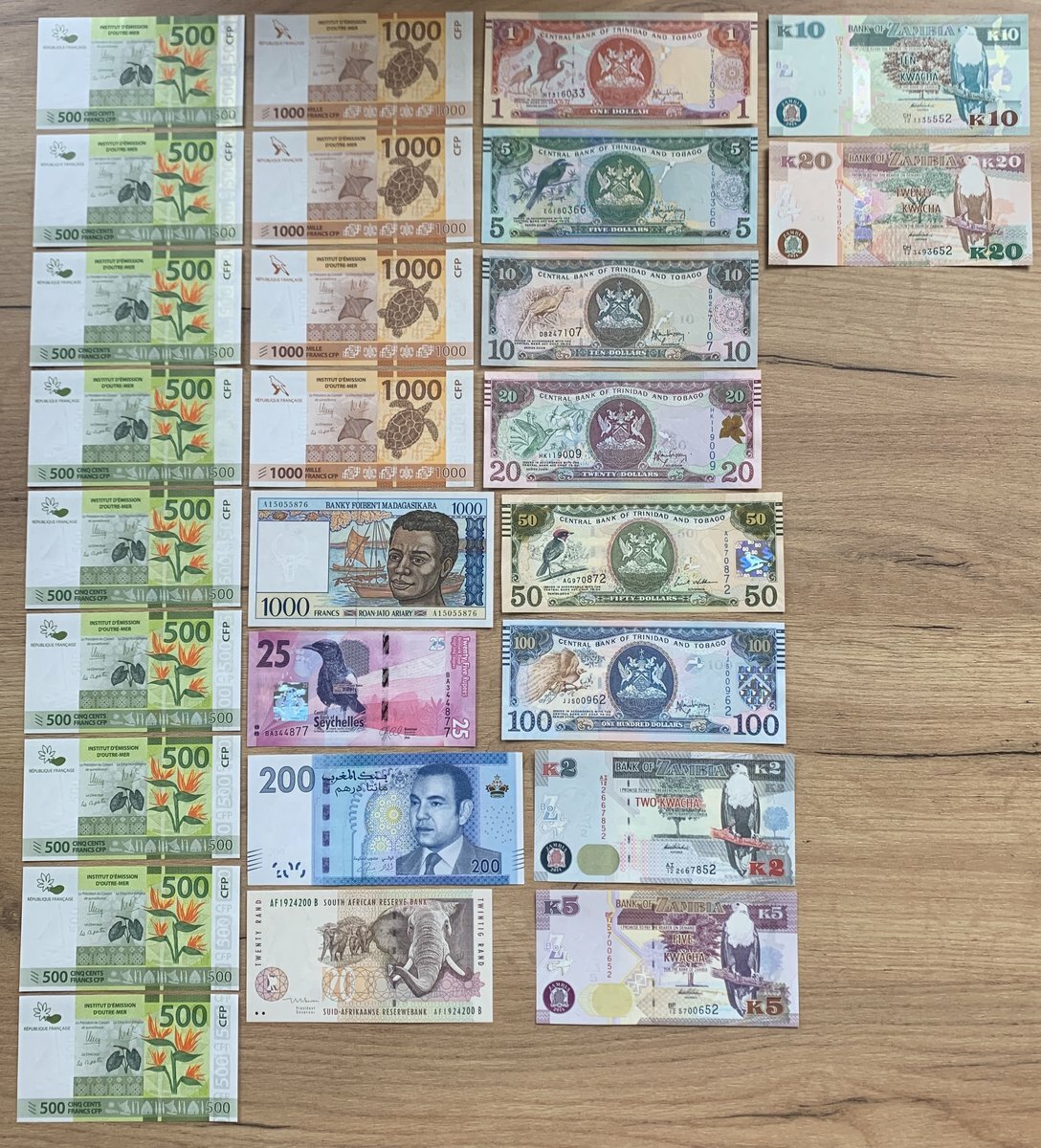 (x) A group of World Banknotes, including French Pacific 500 francs (9), 1000 francs (4) 2014, Madagascar 1000 francs 1994, Morocco 200 dirhams 2013, Seychelles 25 rupees 2016, South Africa 20 rand 2009, Trinidad and Tobago 1, 5, 10, 20, 50 and 100 dollars 2006, Zambia, 2, 5, 10 and 20 kwacha, 2012-2014,