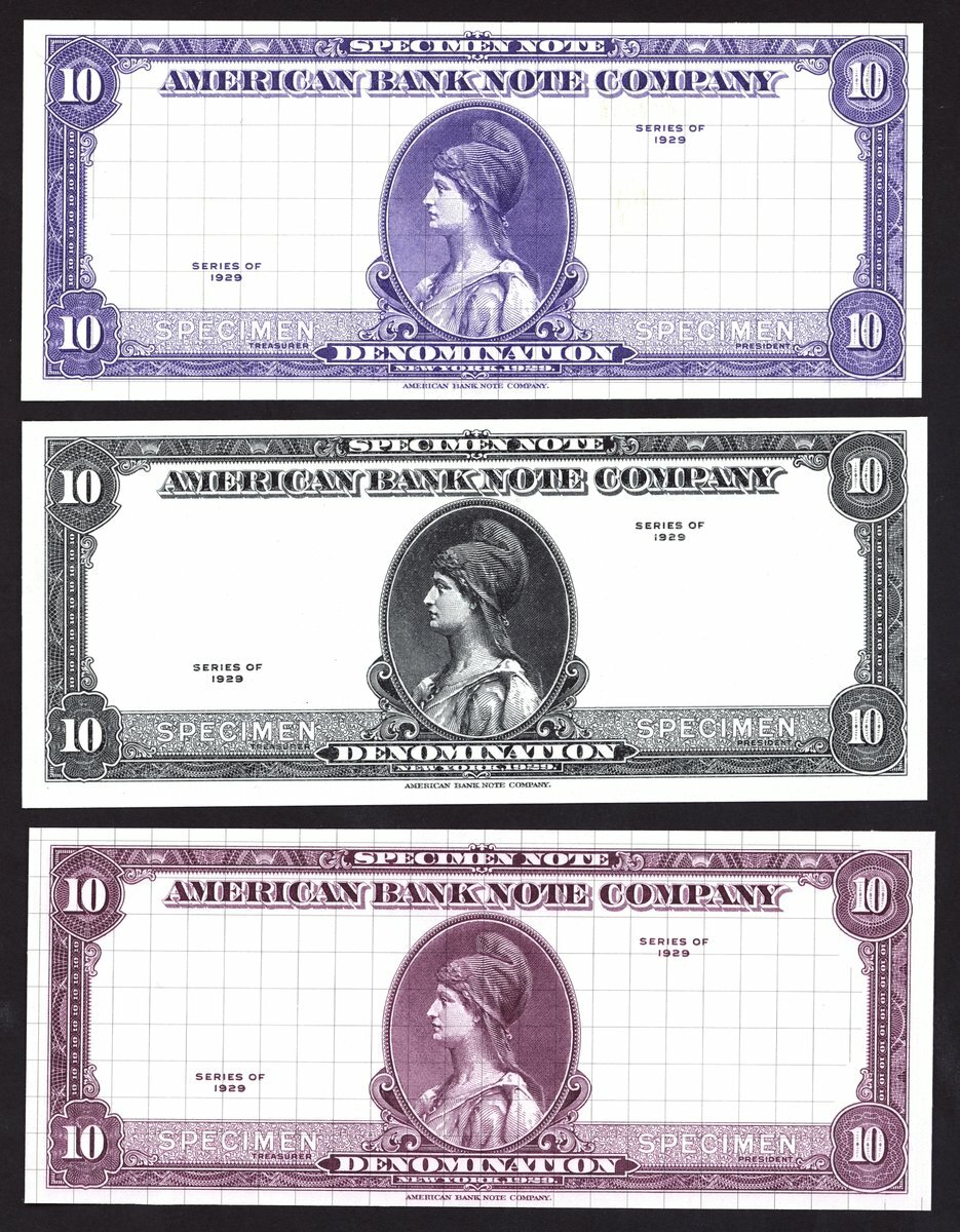 American Banknote Company, three test notes, uniface, three colours, two with grid,