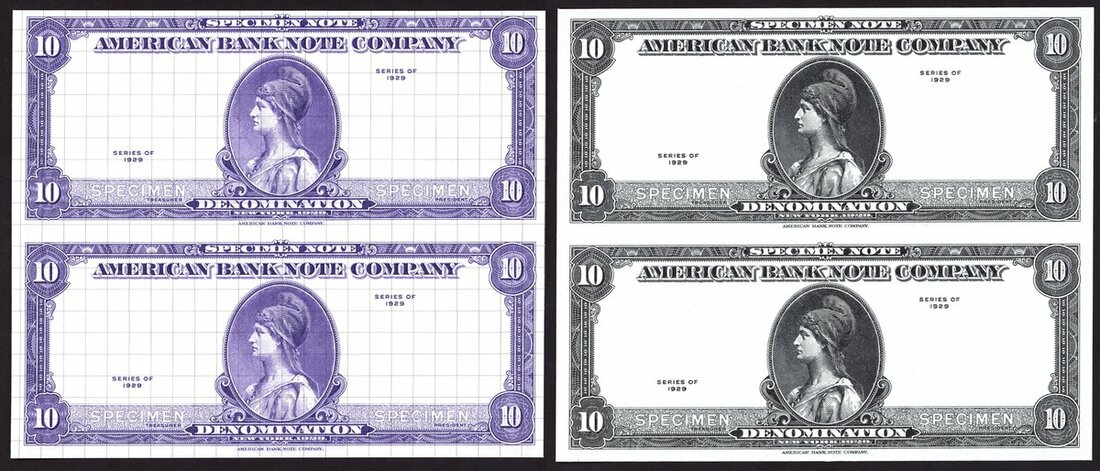 American Bank Note Company, two uncut pair of test notes, two colours, one with grid,