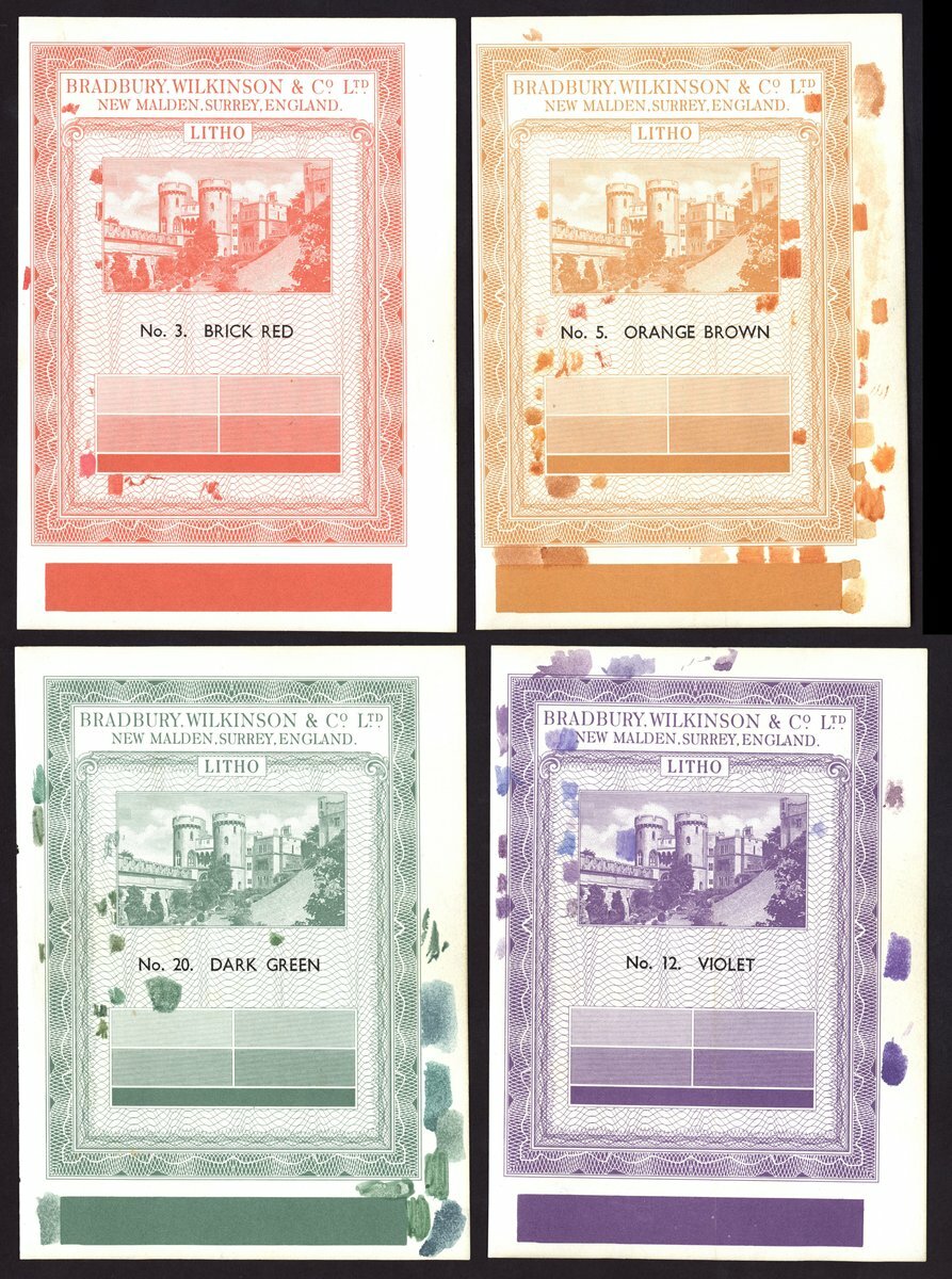 Bradbury Wilkinson & Co. four colour standards, ND (1950s), in brick red, orange brown, violet and dark green, with the standard design featuring Windsor Castle,