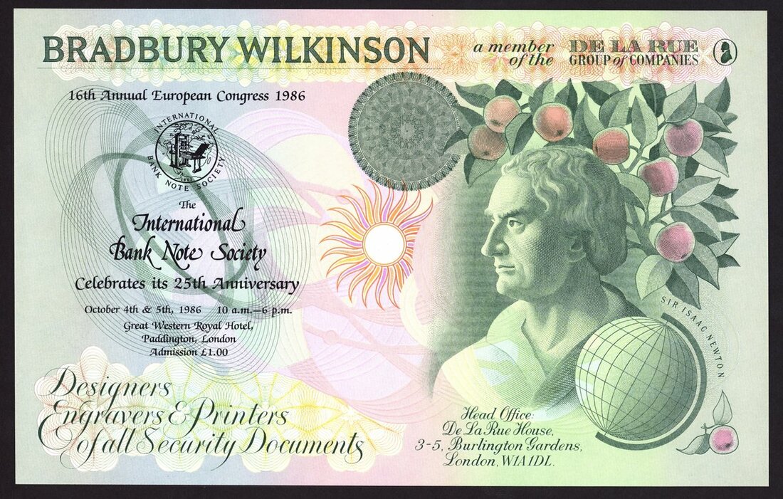 Bradbury Wilkinson, Promotional Banknote, 1986, portrait of Sir Isaac Newton,