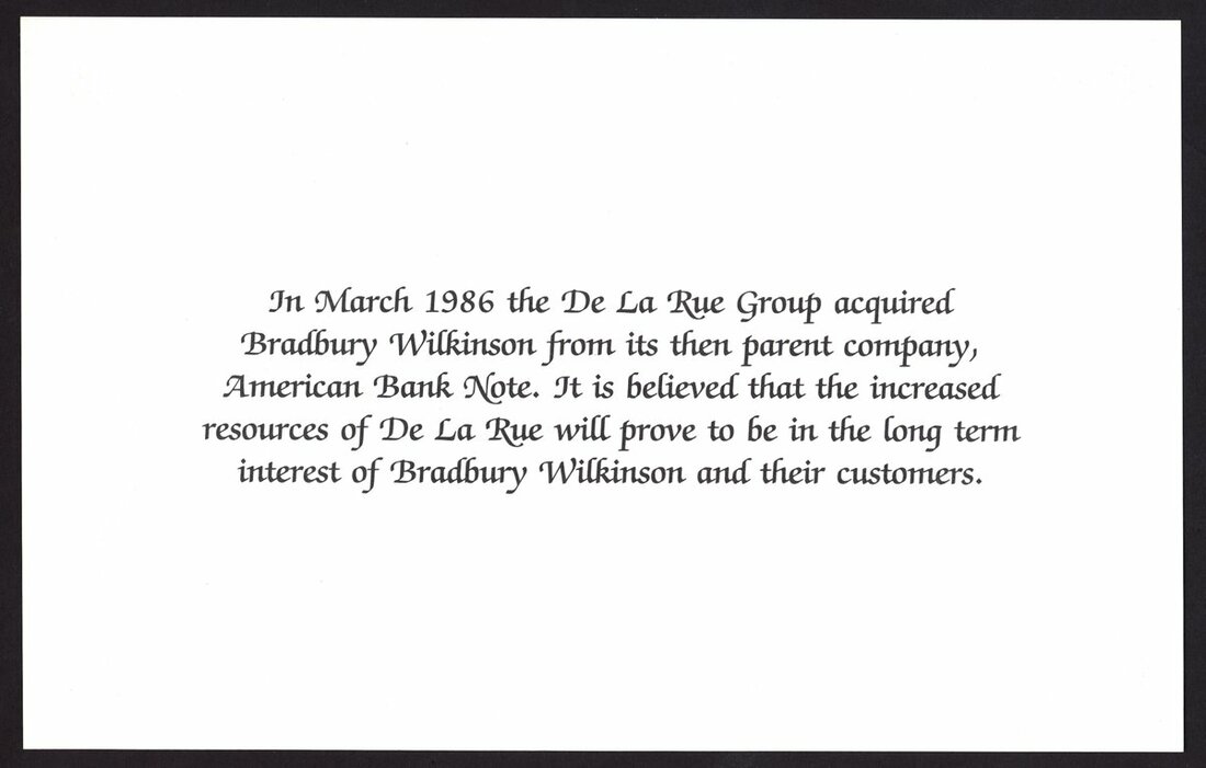 intaglio print, with statement that De La Rue has acquired Bradbury Wilkinson on reverse, uncirculated