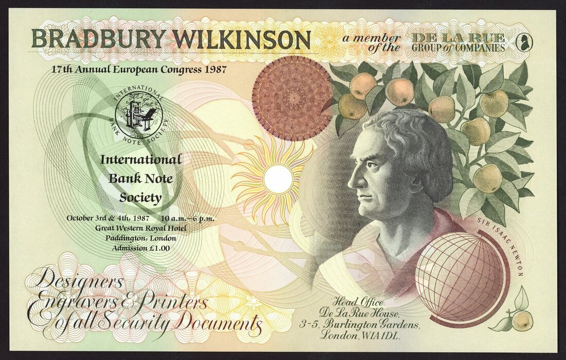Bradbury Wilkinson, Promotional Banknote, 1987, portrait of Sir Isaac Newton,