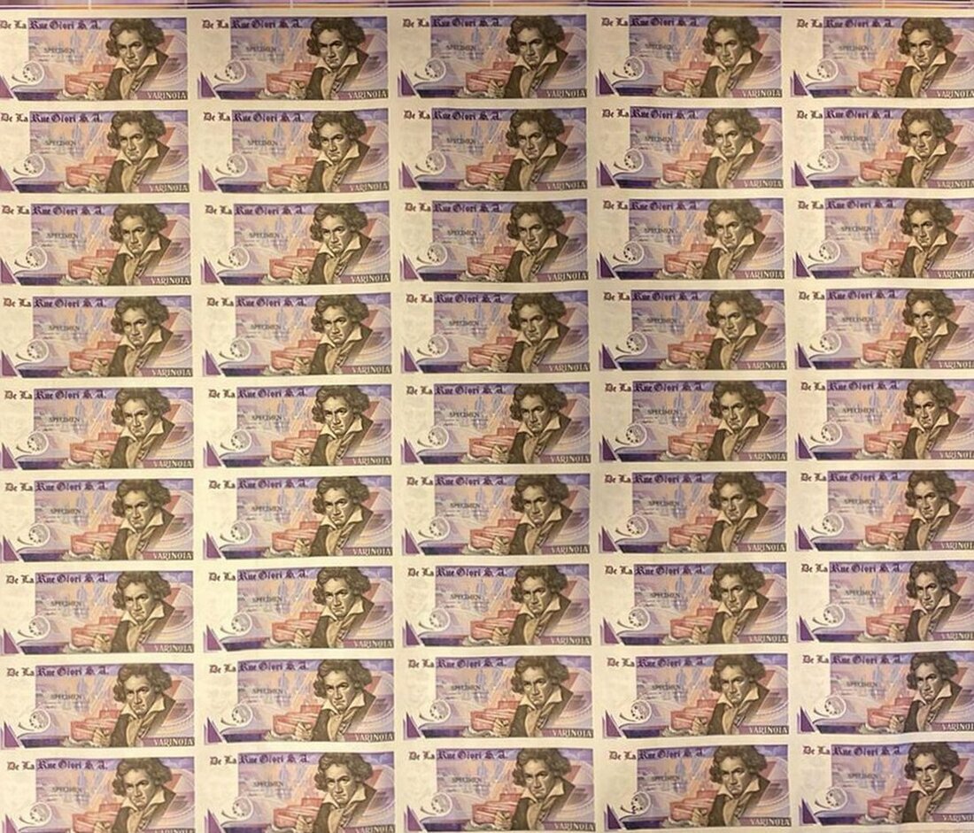 De La Rue Giori S.A Test Sheet, Specimen Sheet of Varinota, Ludwig Van Beethoven, reverse 1 Varinota and a scene with Beethoven,