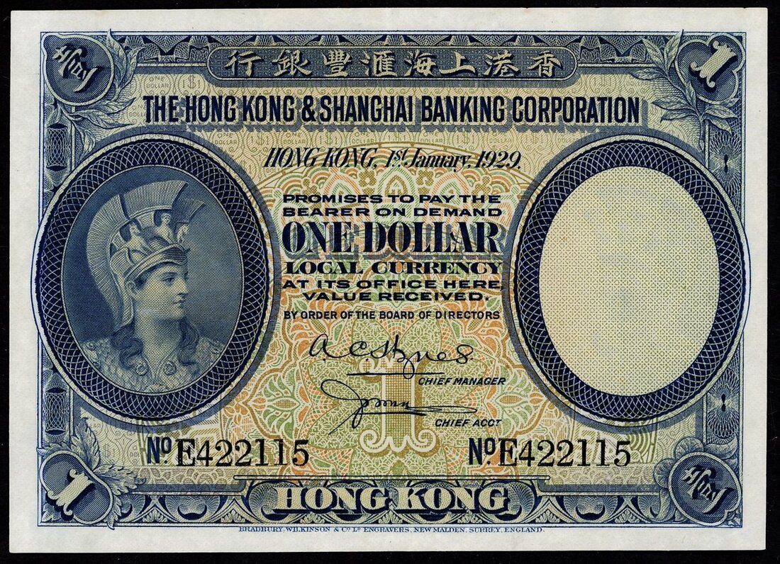 (x) Hong Kong & Shanghai Banking Corporation, $1, 1 January 1929, serial number F422115, (Pick 172b, TBB B655b), in PCGS holder 55 About Unc