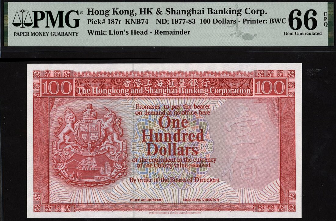 HongKong and Shanghai Banking Corporation, remainder 100 dollars, ND (1977-83), no serial numbers or signatures,