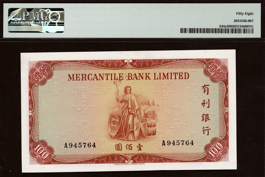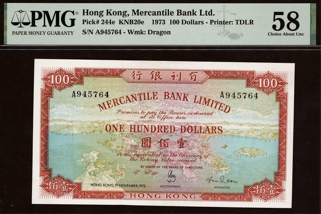 (x) Mercantile Bank Limited, Hong Kong, 100 dollars, 1 November 1973, serial number A945764, (Pick 244e), last date of this type and second to last type for Mercantile Bank, in PMG holder 58 Choice About Unc, quite scarce in this grade