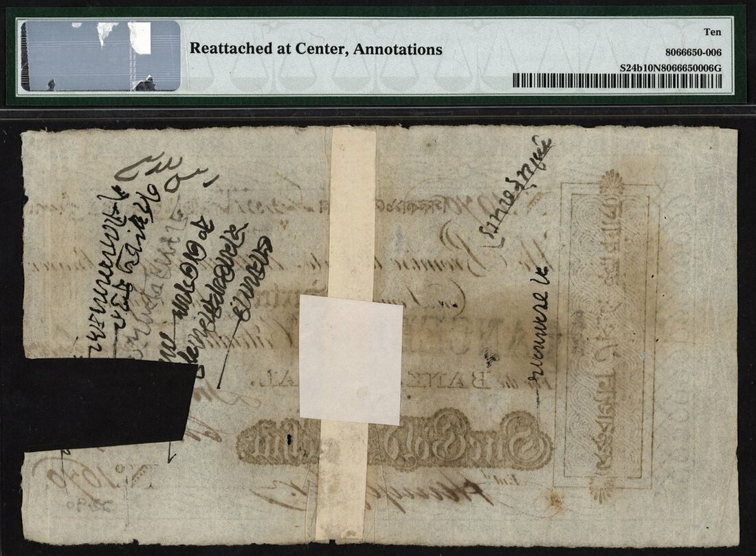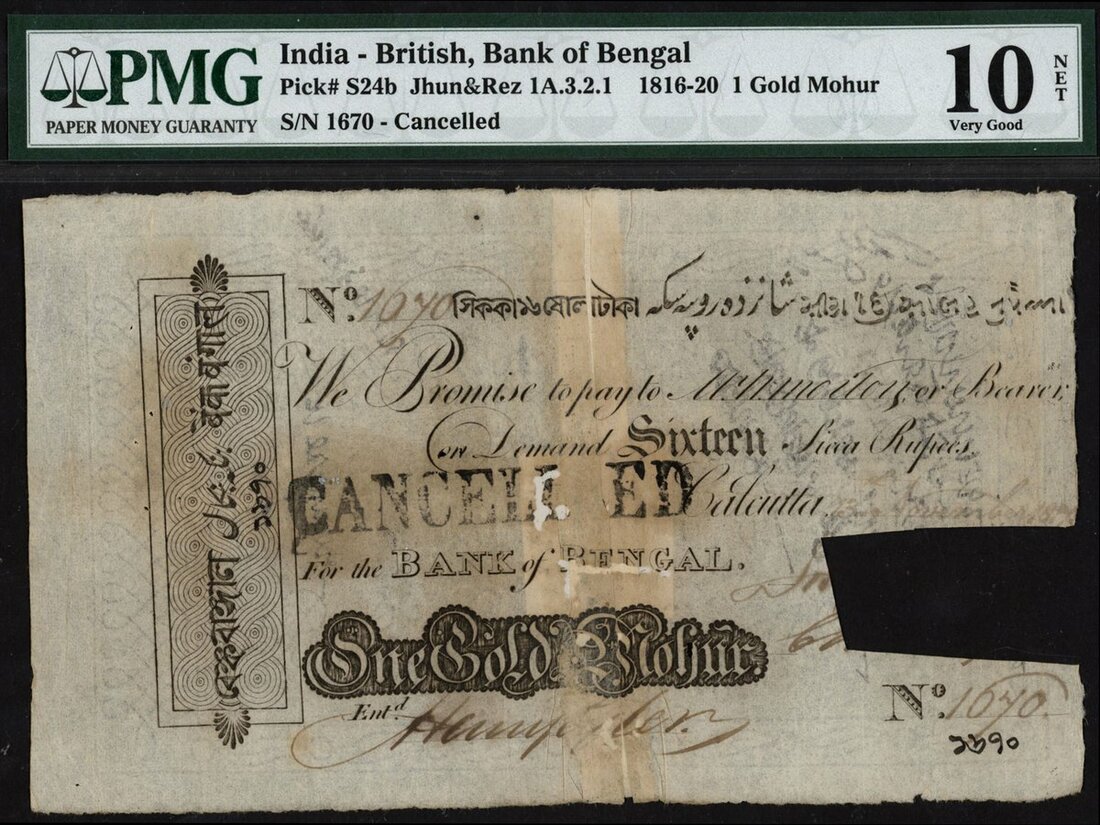 (x) Bank of Bengal, India, 1 Gold Mohur / 16 Sicca Rupees, 1816-20, serial number 1670, (Pick S24b, Razack-Jhunjhunwalla 1A.3.2.1), in PMG holder, reattached at centre, annotations, 10 NET Very Good. Very scarce early issue