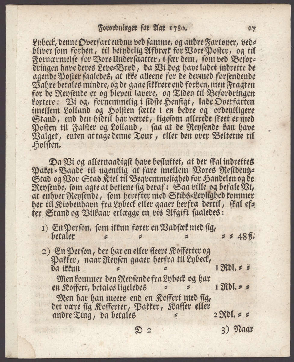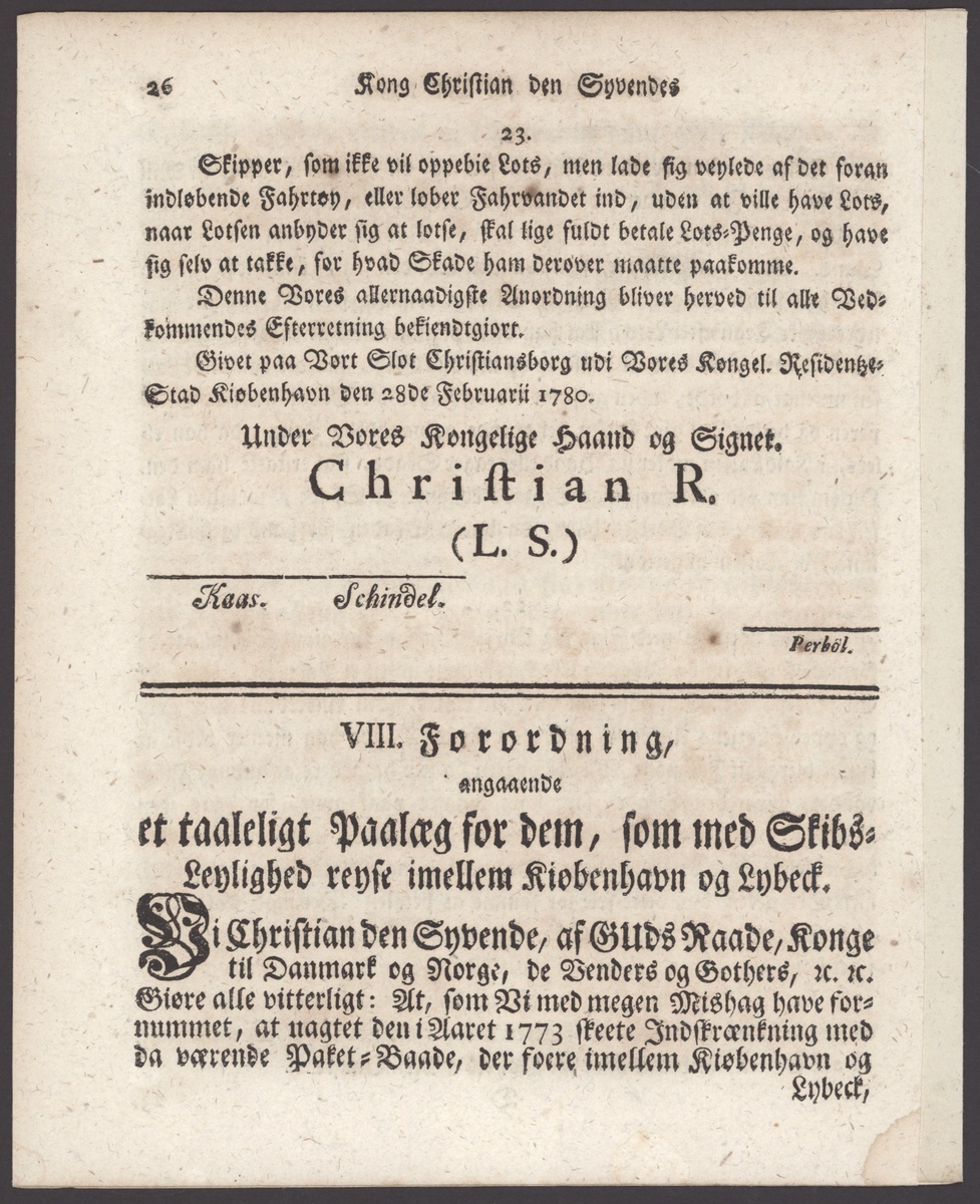 1780 (28 Feb.), four page Royal Decree from Christian VII regarding shipping between Copenhagen and Lubeck; fine