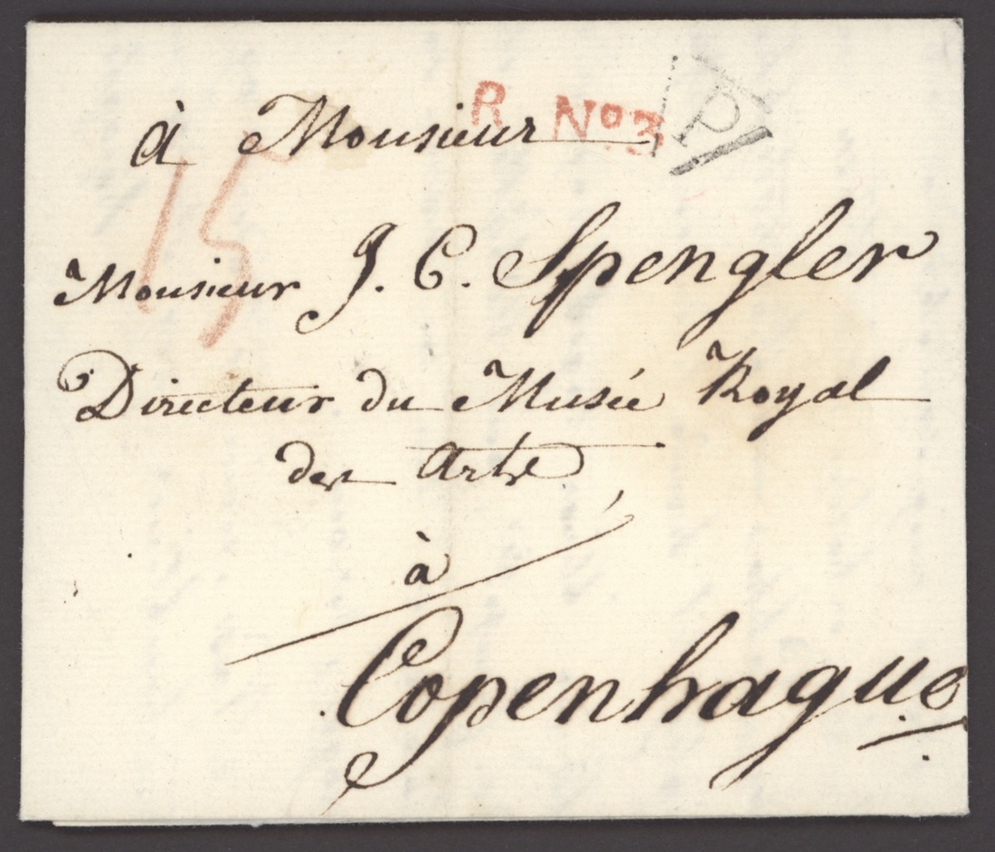 1808 (14 Aug.) entire letter from Paris to Copenhagen, with "P" in triangle and red "R.No. 3", one reverse list number 231, Postage 22Lsk., censored and sealed by mourning black "