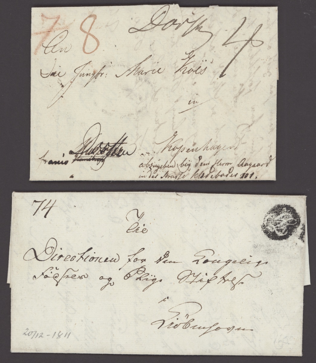 1808 (13 Sept.) entire letter from Duisburg to Copenhagen, censored and with black Konigl Danisches Post Amt Zu Hamburg seal on the reverse, 1811 (20 Dec.) entire letter from Skien to the Royal Confinement and Treatment Foundation in Copenhagen, carried privately to Denmark and with Fodpost cachet and listing number 74; fine