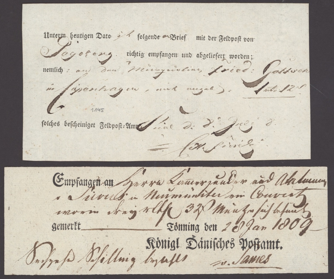 1808, receipt for accepting a letter at a Field Post Office in Schleswig-Holstein, 1809 Postal receipt from the Royal Danish Post Office in Tonning; fine