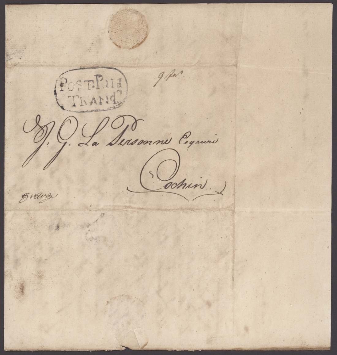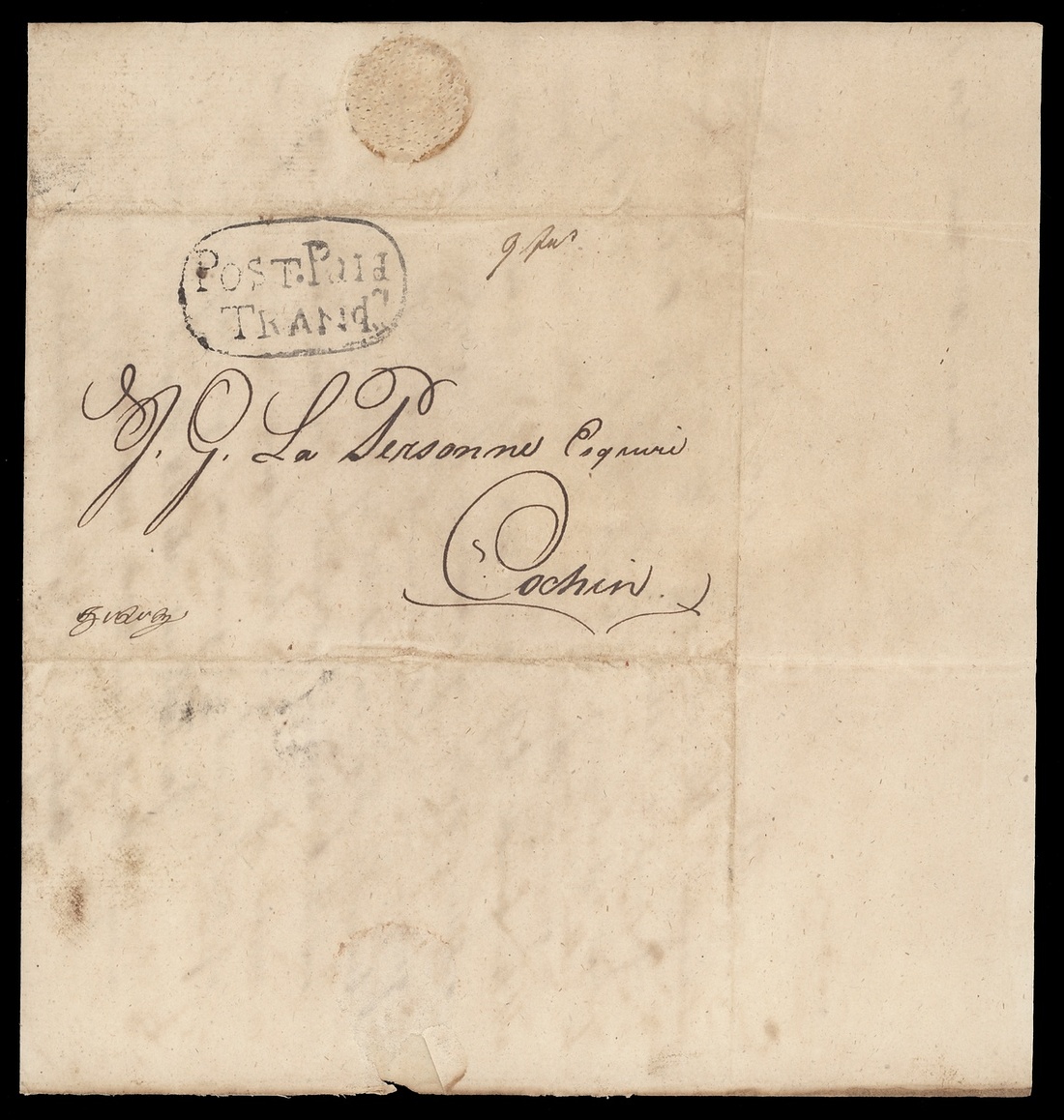 1800 (10 Oct.) entire letter from the Danish-Norwegian settlement in South East India, temporarily occupied by the British from May 1801 to Aug. 1802 (and Jan. 1808 to Dec. 1814), with fine "Post Paid/TraNq" in oval (Hammond-Giles type 1). The letter is written in Dutch by the Norwegian settler Jens Koefoed (who later became Governor of Danish East India) and is addressed to Cochin in Travancore; some splits along the folds, fine