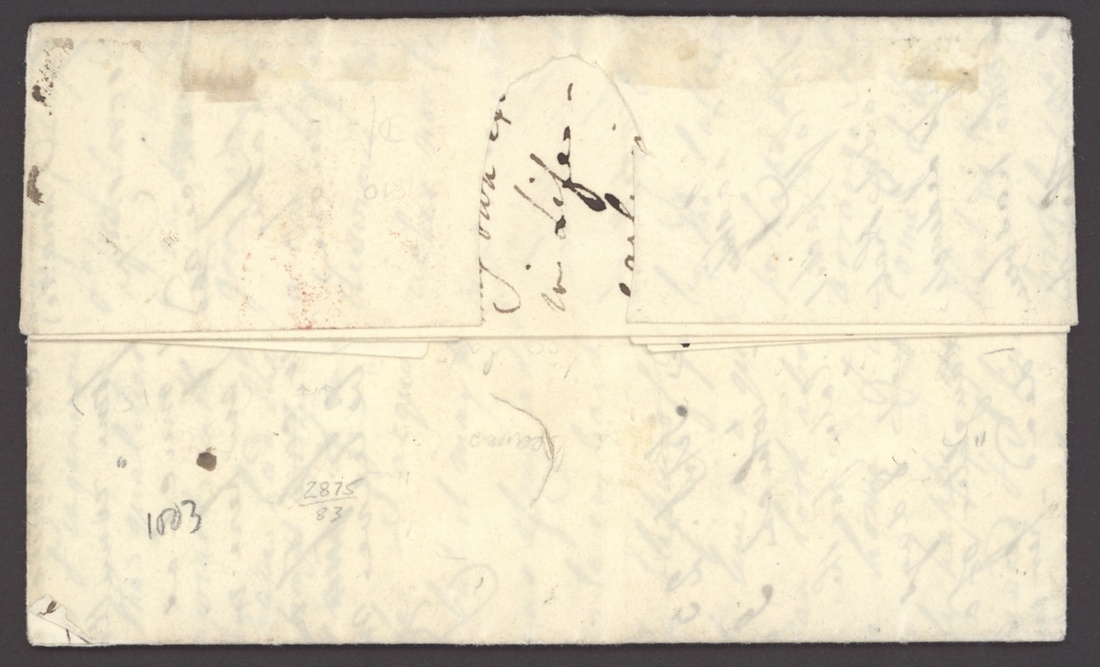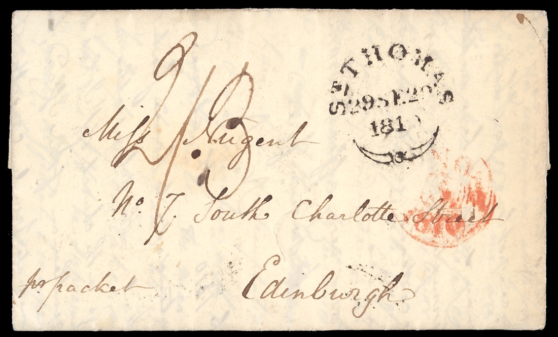 1810 (29 Sept.) entire letter, endorsed "pr. packet", to Edinburgh with a superb strike of the smaller St. Thomas fleuron datestamp, rated "2/3" in manuscript and with arrival datestamp in red; fine and rare
