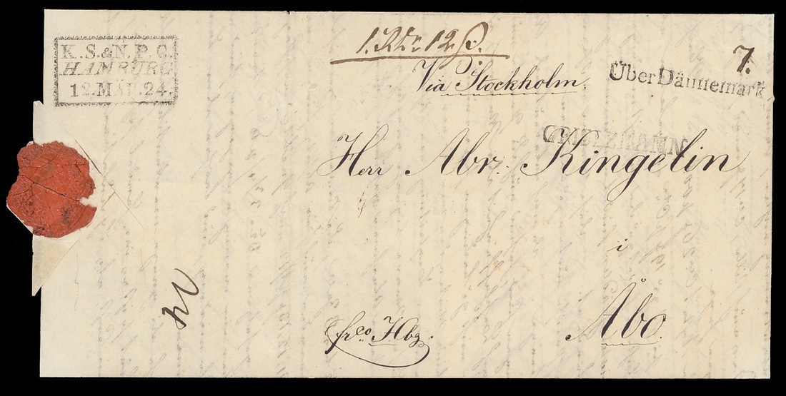 1824 (8 March) entire letter from Lübeck to Åbo, endorsed "Via Stockholm", with list no. "7", and "1RDr.12P" (1 Rigsdaler and 12 Skilling Banco) in manuscript, "Über Dännemrk" and "