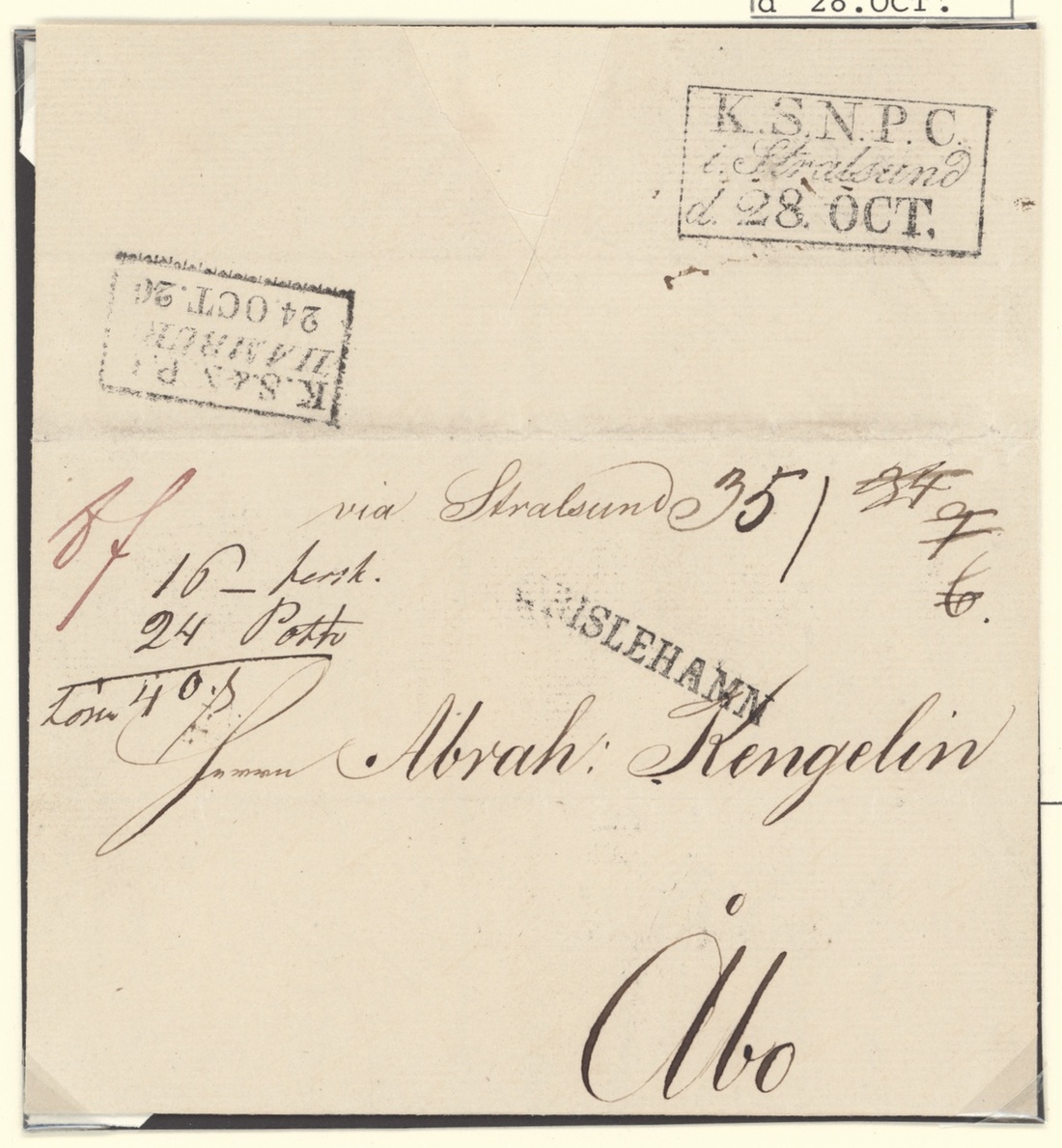 1826 (Oct. 24), entire from Hamburg to Åbo, endorsed "via Stralsund" with "