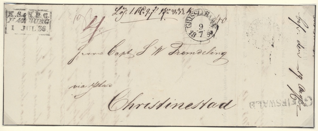 1836 (1 July) entire letter from Hamburg to Christinestad, via Greifswald, Ystad, Stockholm and Grisselhamn with Grisselhamn datestamp and a variety of manuscript rate markings on the front, Greifwald handstamp and framed