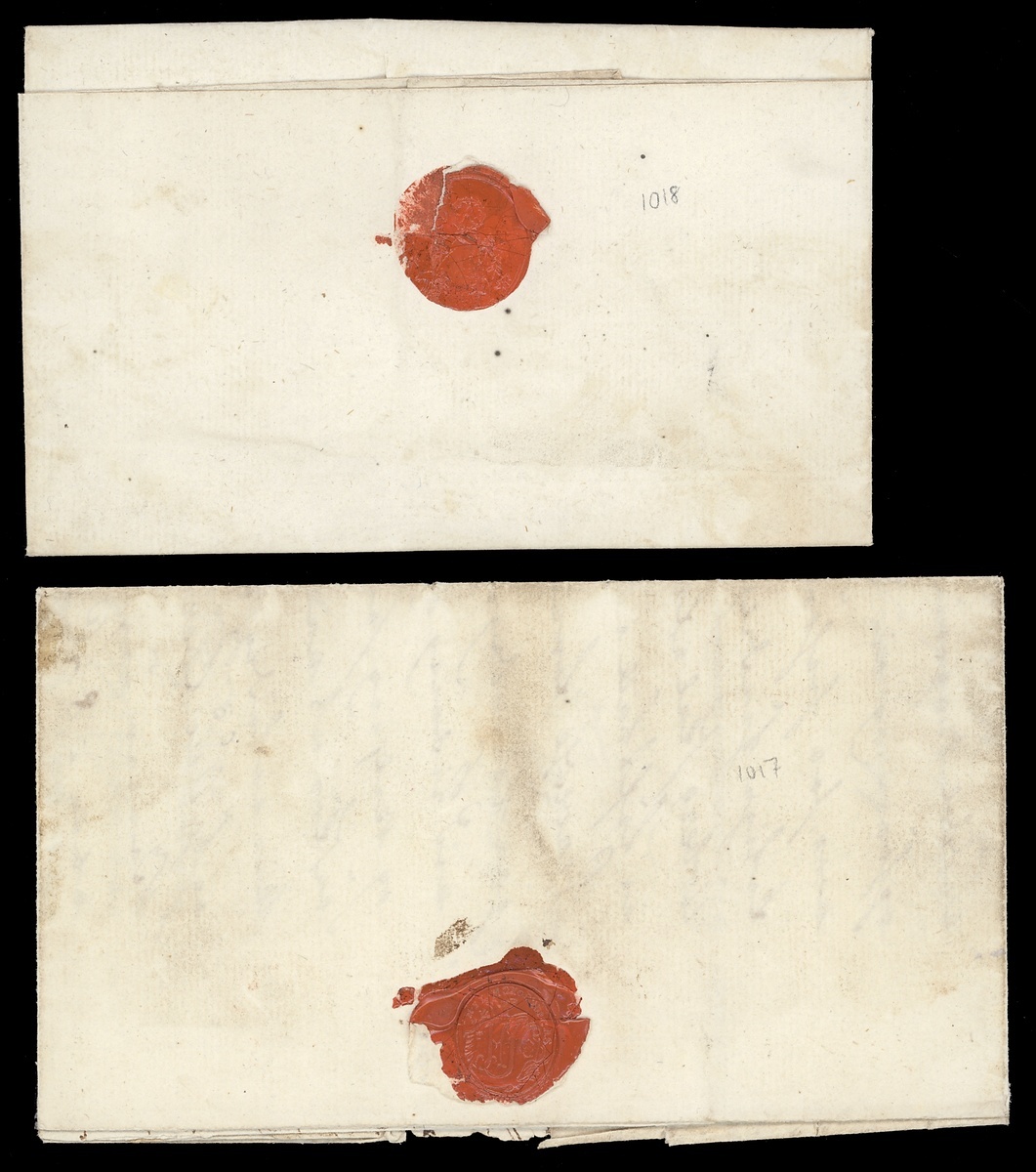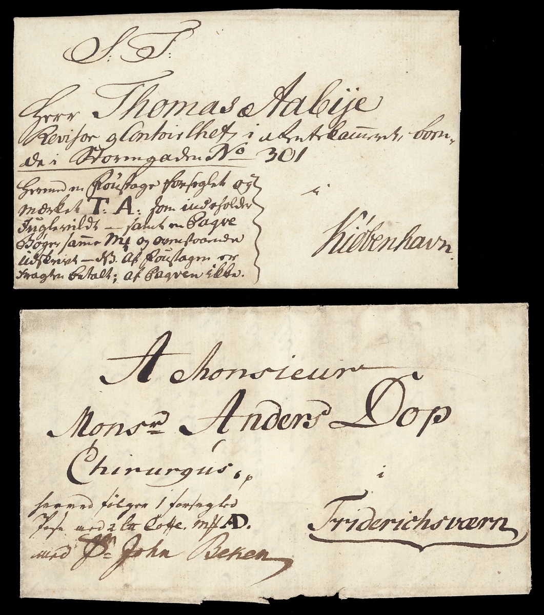 1806 (10 June) Private parcel letter, following two parcels from Rakkestad to Copenhagen, endorsed "My Commissary on Friederichald" and with "TA". Also 1786 (23 May) a similar parcel letter from Copenhagen to Frederiksvern marked "AD"; fine