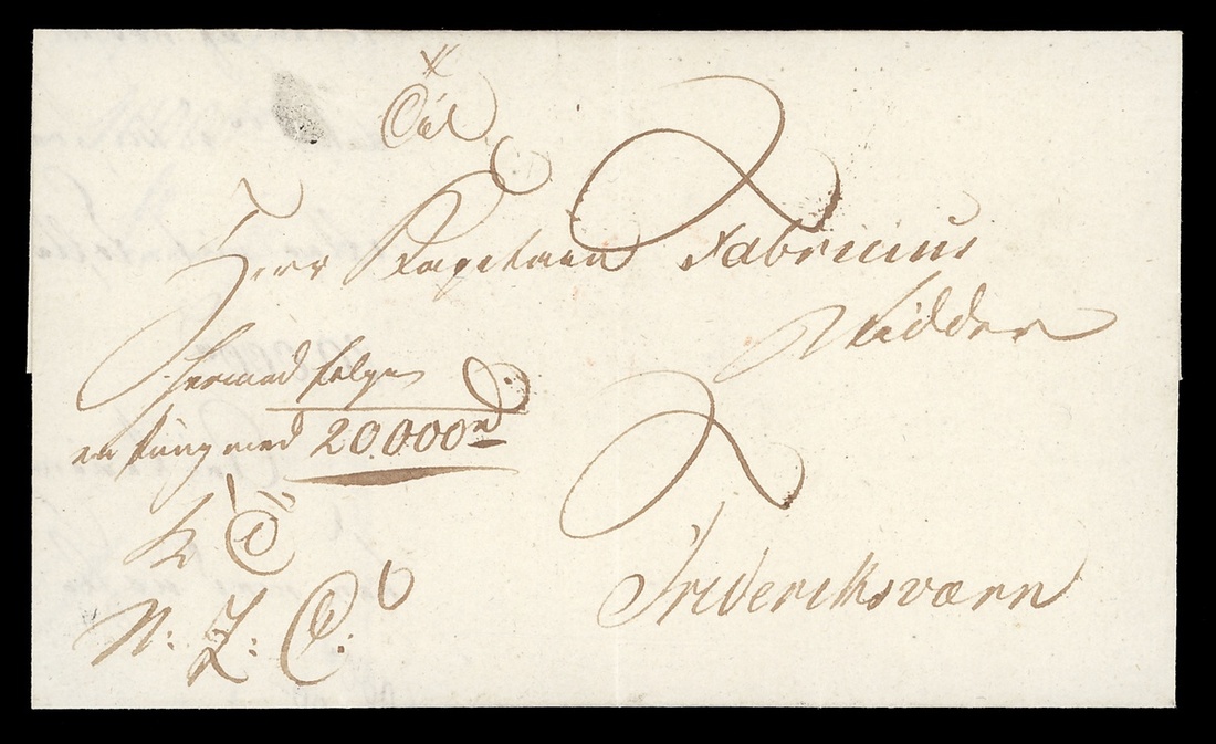 1809 (4 April), Bank entire from Christiania to Frederiksvaern, without postal markings but endorsed "Hermed føgler en pung me 20,000 rdl."; fine and scarce