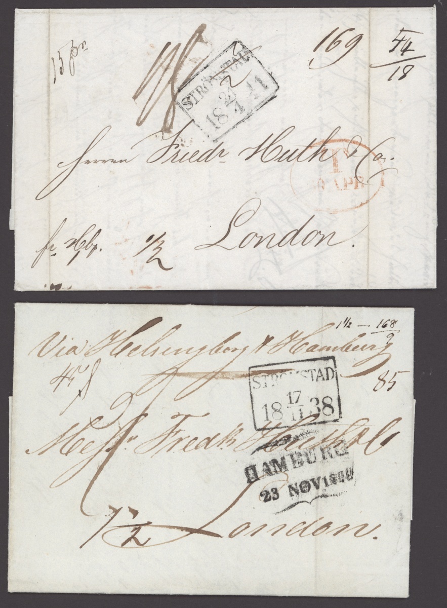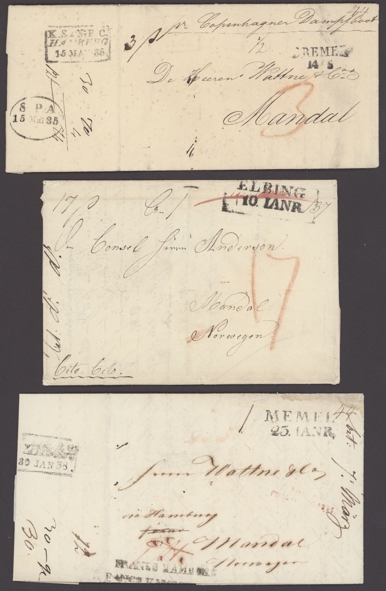 1835-41, five entire letters, comprising 1835 from Bremen to Mandal, 1836 from Elbing to Mandal (endorsed "Cito Cito"), 1836 from Memel to Mandal, 1838 and 1841 Huth correspondence entire letters from Christiania to London; good to fine