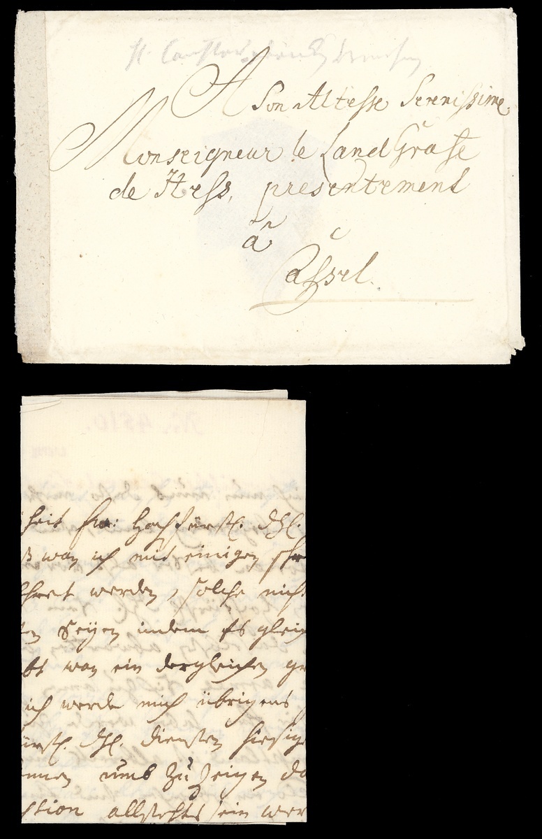 1718 (13 Sept.) entire, with contents, from the German General Von Leutrum "near the Norwegian border" to the Landgraf of Hessen-Kassel; seal removed from the reverse and the entire strengthened at left. A rare item from the Great Nordic War 1700-1720